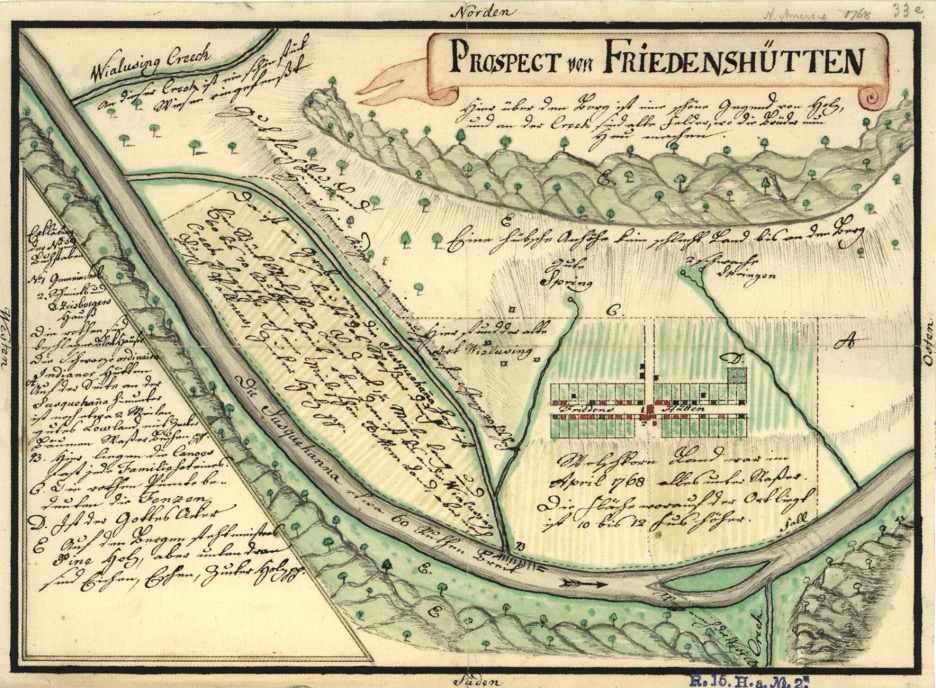 Located on the site of the proposed LNG project is a historic marker, memorializing the pre-Colonial settlement of Friedenshütten. Here, indigenous Mahican, Lenape, and Haudenosaunee converts to Christianity lived with Moravian missionaries. The village was active between 1765 and 1772. According to Katherine Faull of Bucknell University “the Friedenshütten mission was dissolved in 1772, ostensibly because of the uncertainty of the land deals that had been made with the Cayuga who had jurisdiction over that part of Pennsylvania.” Portions of the settlement structure area visible in the 1768 map (Figure 1) are 700 feet from the New Fortress methane liquefaction buildings.
