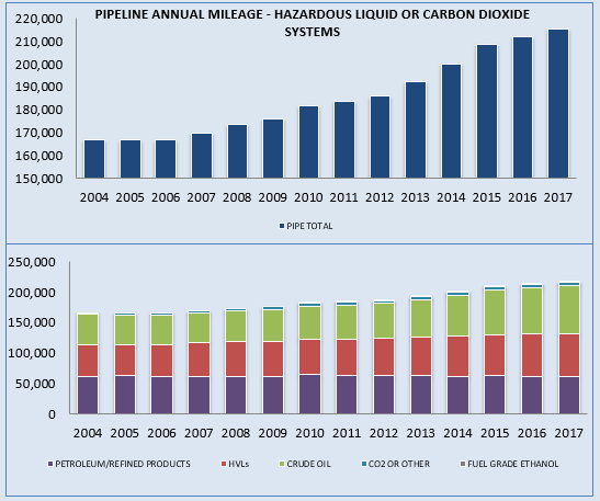 Although total mileage for transmission pipelines slightly dropped between 2004 and 2017 (according to the Pipeline and Hazardous Materials Safety Administration), total mileage for Hazardous Liquids pipelines jumped 33% during that same period (Figures 2 and 3).