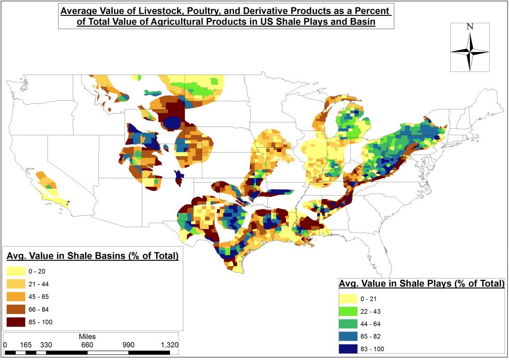 In total, there are 589,922 and 1,369,961 farms in US Shale Plays and Basins, respectively, averaging between 589 and 646 acres in size and spread across 2,146 counties (Figure 1). These farm counties produce roughly $87.31- 218.32 billion in agricultural products each year with the highest value per-acre being the Monterey and Monterey-Temblor Formations of Southern California, the Niobrara Formation in North Central Colorado, Eastern Barnett in North Central Texas, the Antrim in Michigan, and the Northern Appalachian Shale Basins of Pennsylvania, New York, and Ohio (Figures 2a/2b). Roughly 52% of all agricultural revenue generated in US Shale Play counties comes from livestock, poultry, and derivative products vs. a national average of 44% (Figure 3).
