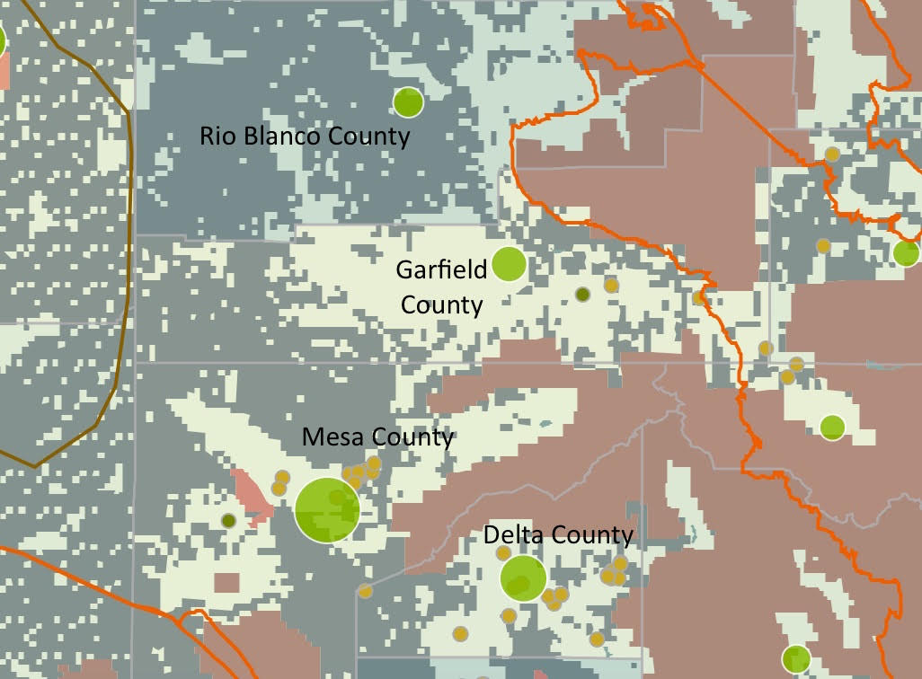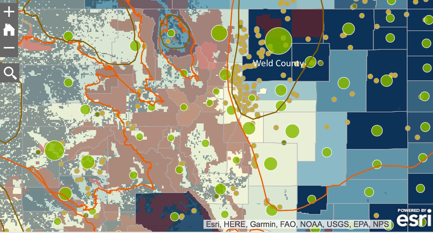 Colorado: Map zoomed into 3 of top agricultural producing and natural gas producing counties in Colorado, illustrating how they are surrounded by public lands.