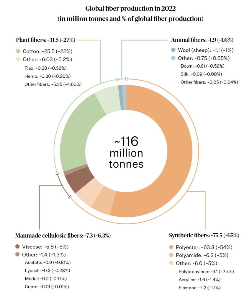 Source: Textile Exchange based on data from CIRFS, FAO, ICAC, IVC, IWTO, Maia Research, and its own modelling. (2023)