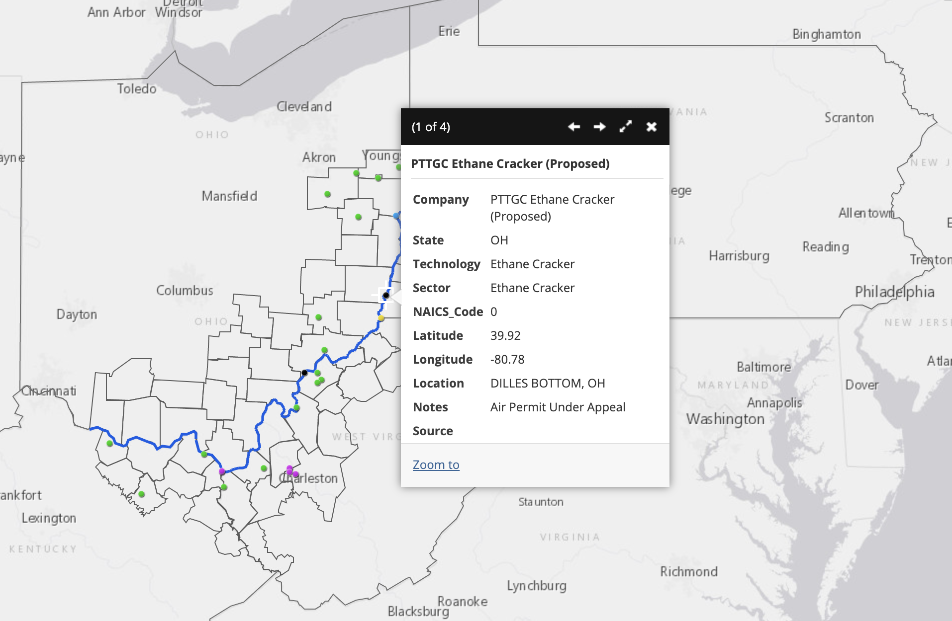 The location of the proposed PTTGC Ethane Cracker in Belmont, Ohio. Go to this map.