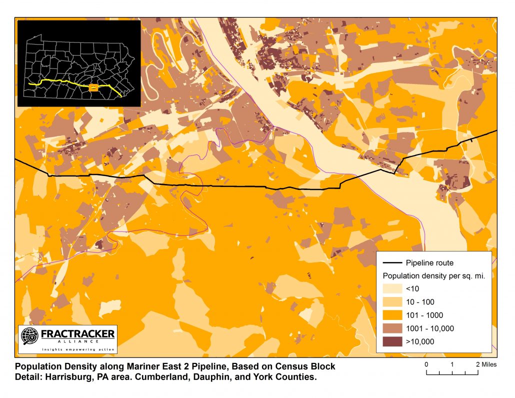 FracTracker Alliance recently created a set of maps showing population variation along the route of the Mariner East 2 Pipeline, which I refer to as the “Dragonpipe.” FracTracker’s maps dramatically reveal a route that runs through many centers of dense population, and seems to avoid relatively nearby areas with far lower population density. The maps are based on US Census 2010 block-level data.