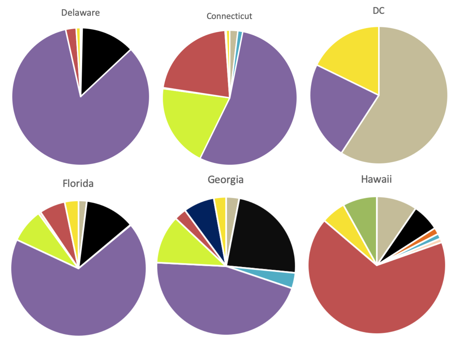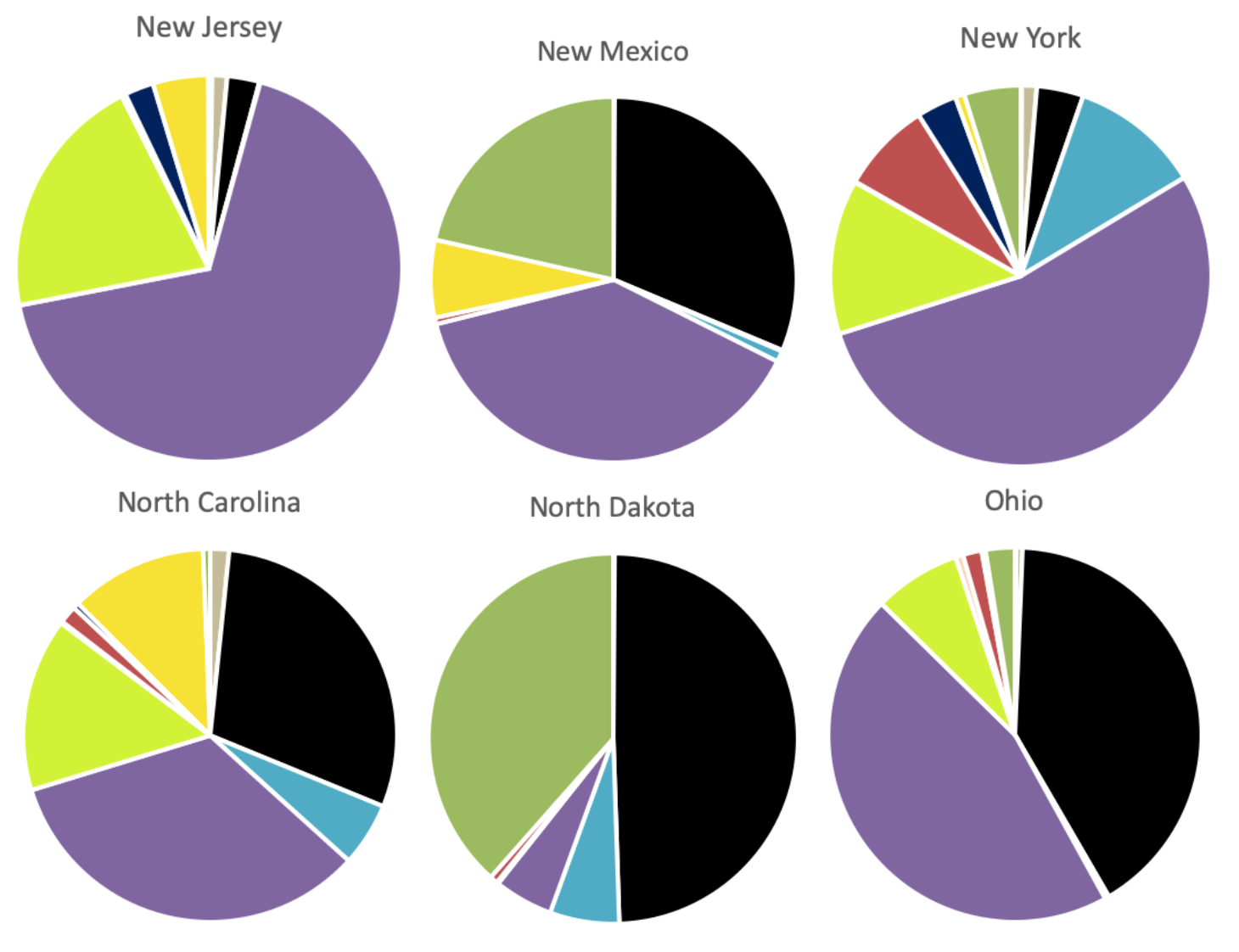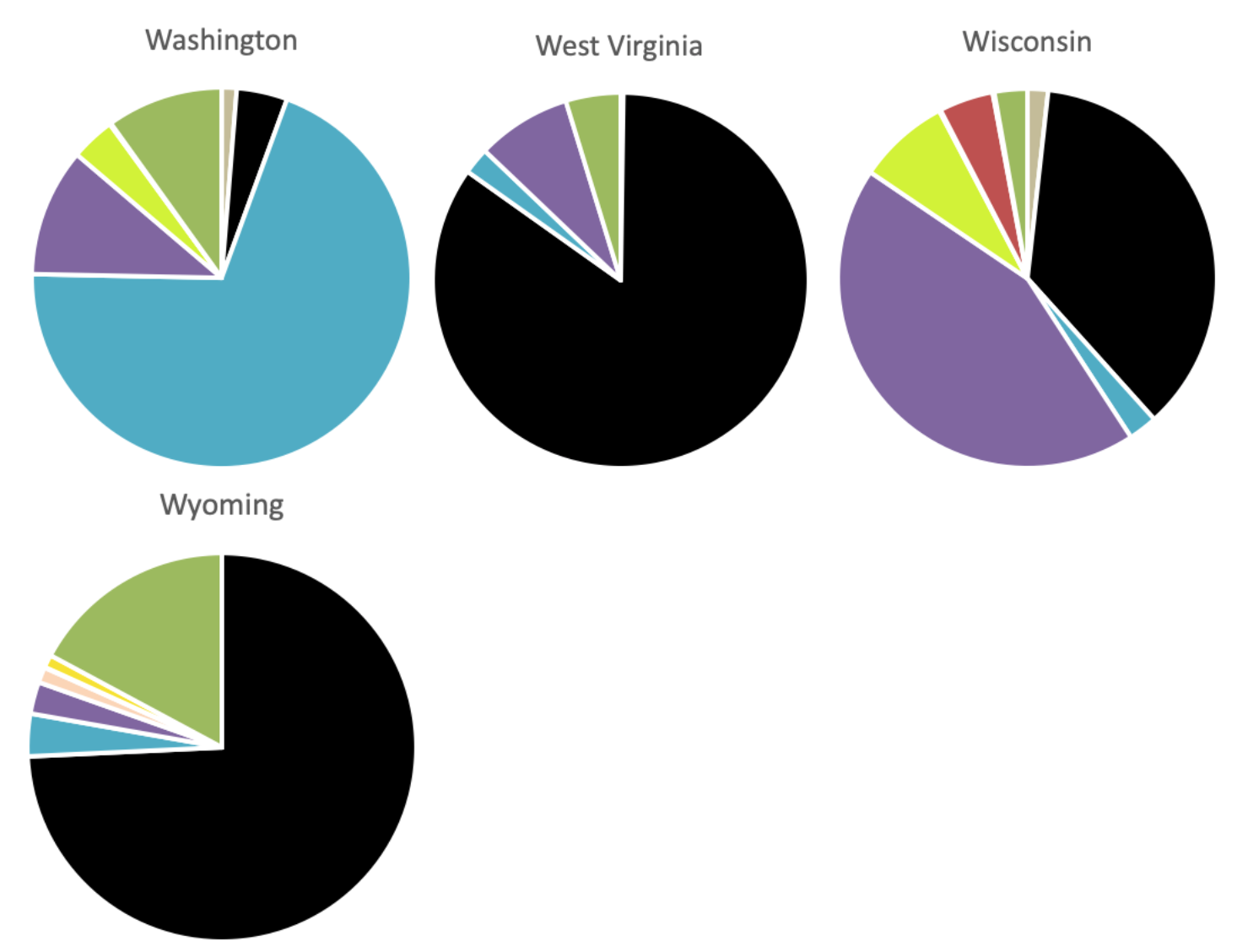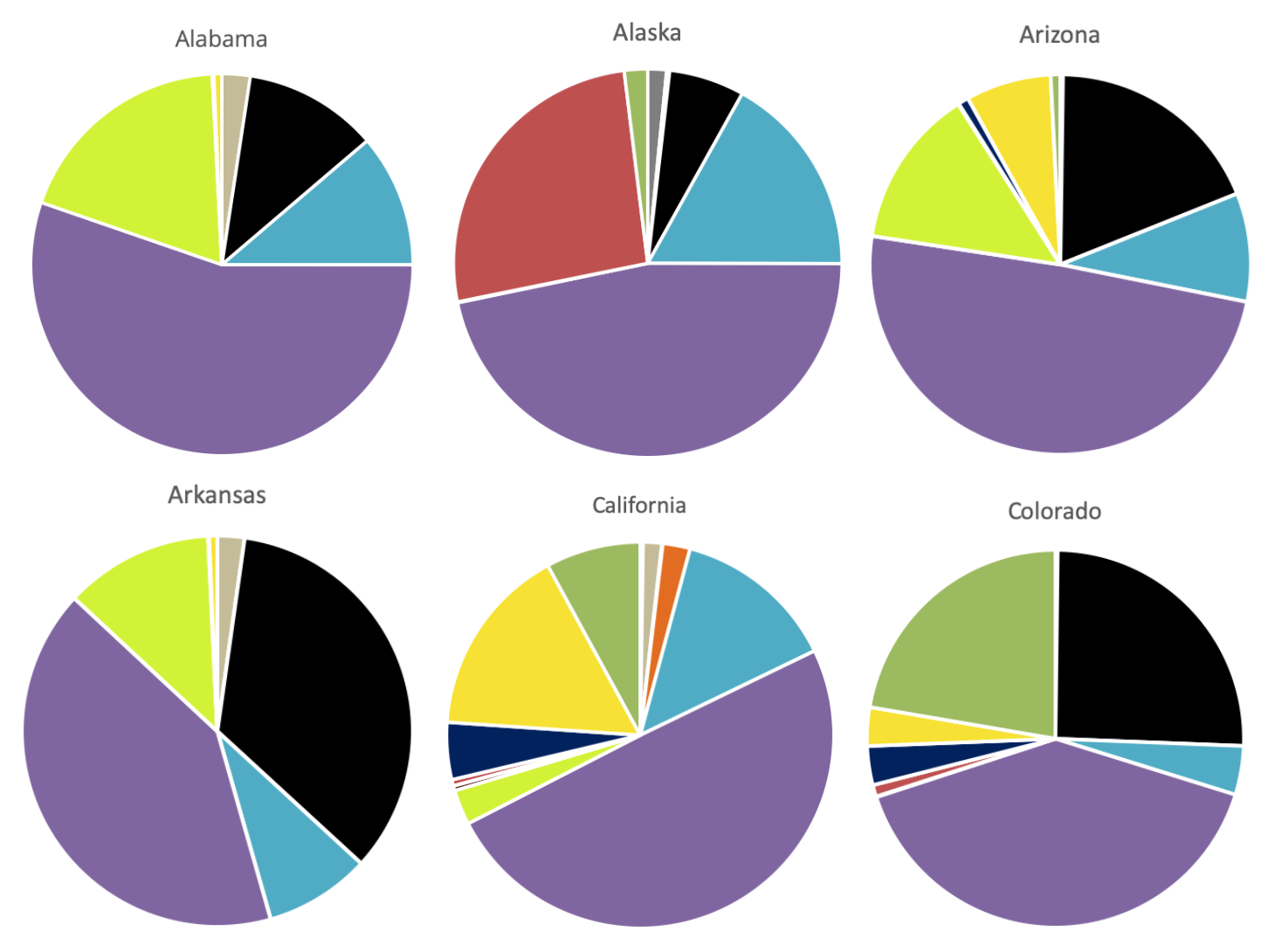 One final factor to consider – the pie pieces on these state charts aren’t weighted equally, with some states’ capacity to generate electricity far greater than others. The top five electricity producers are Texas, California, Florida, Pennsylvania, and Illinois.