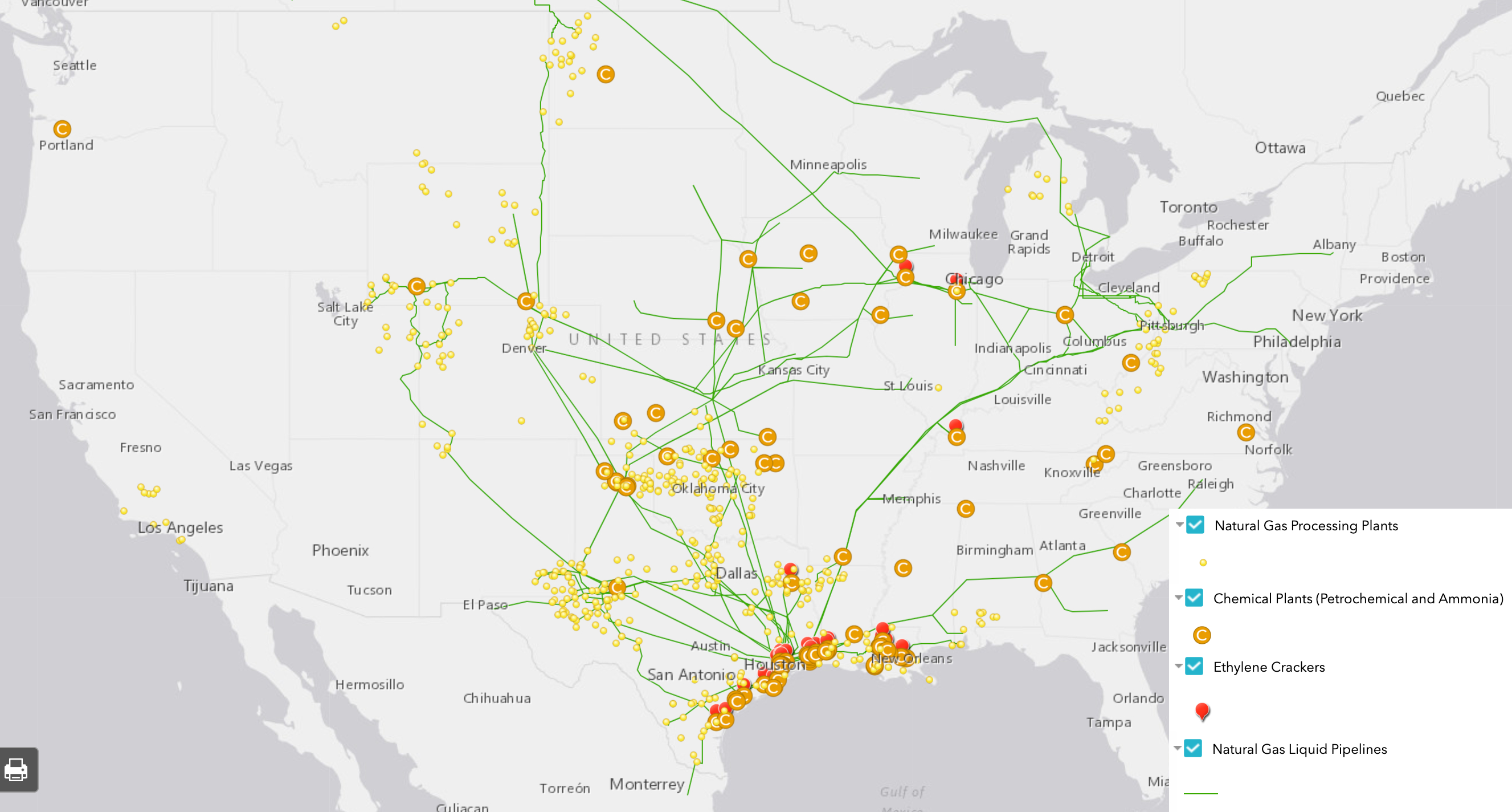 Many of the oil and gas infrastructure on the map doesn’t go towards energy at all, but rather aids in manufacturing petrochemicals – the basis of products like plastic, fertilizer, solvents, detergents, and resins.