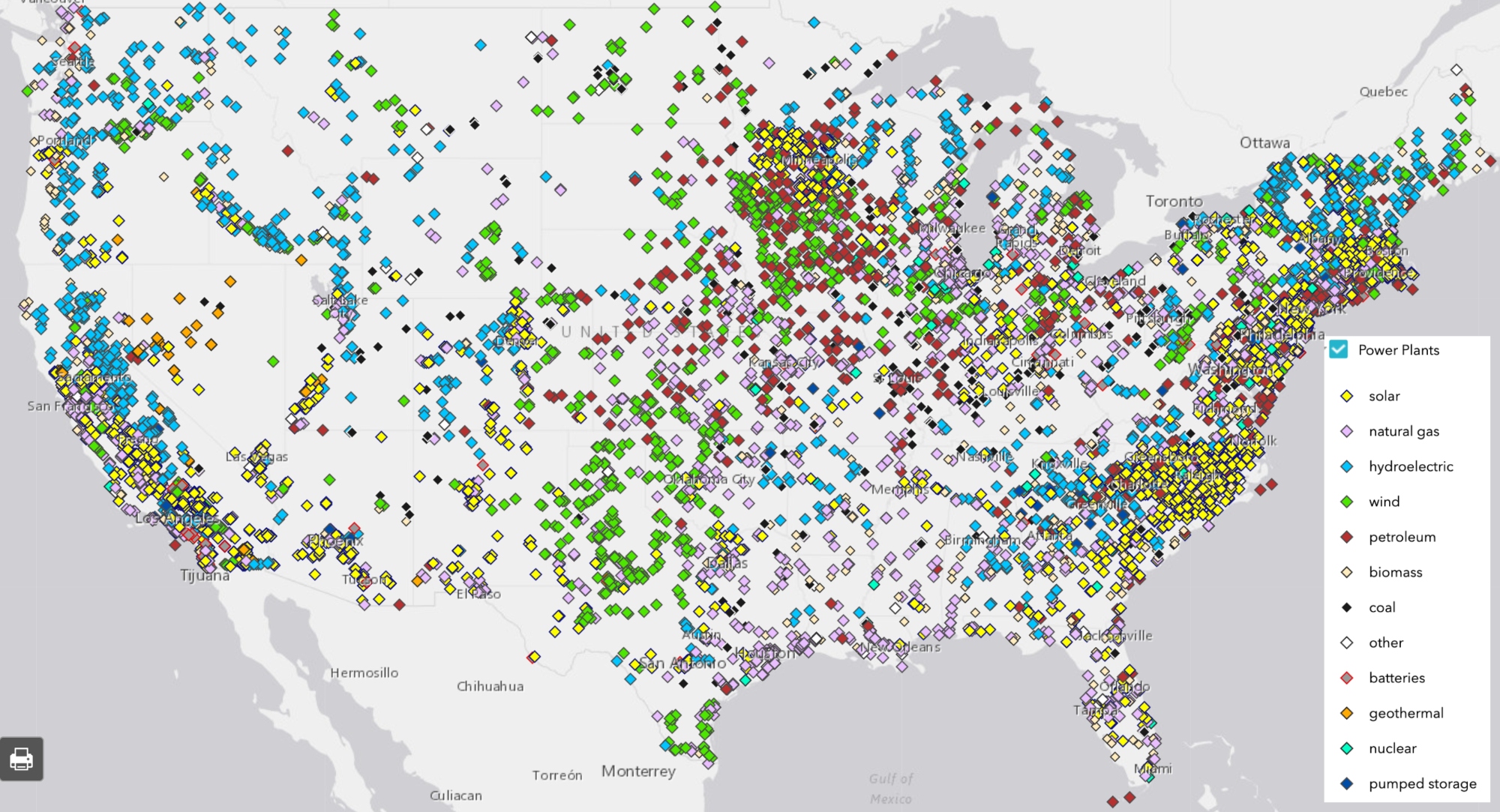 The “power plant” legend item on this map contains facilities with an electric generating capacity of at least one megawatt, and includes independent power producers, electric utilities, commercial plants, and industrial plants. What does this data reveal?