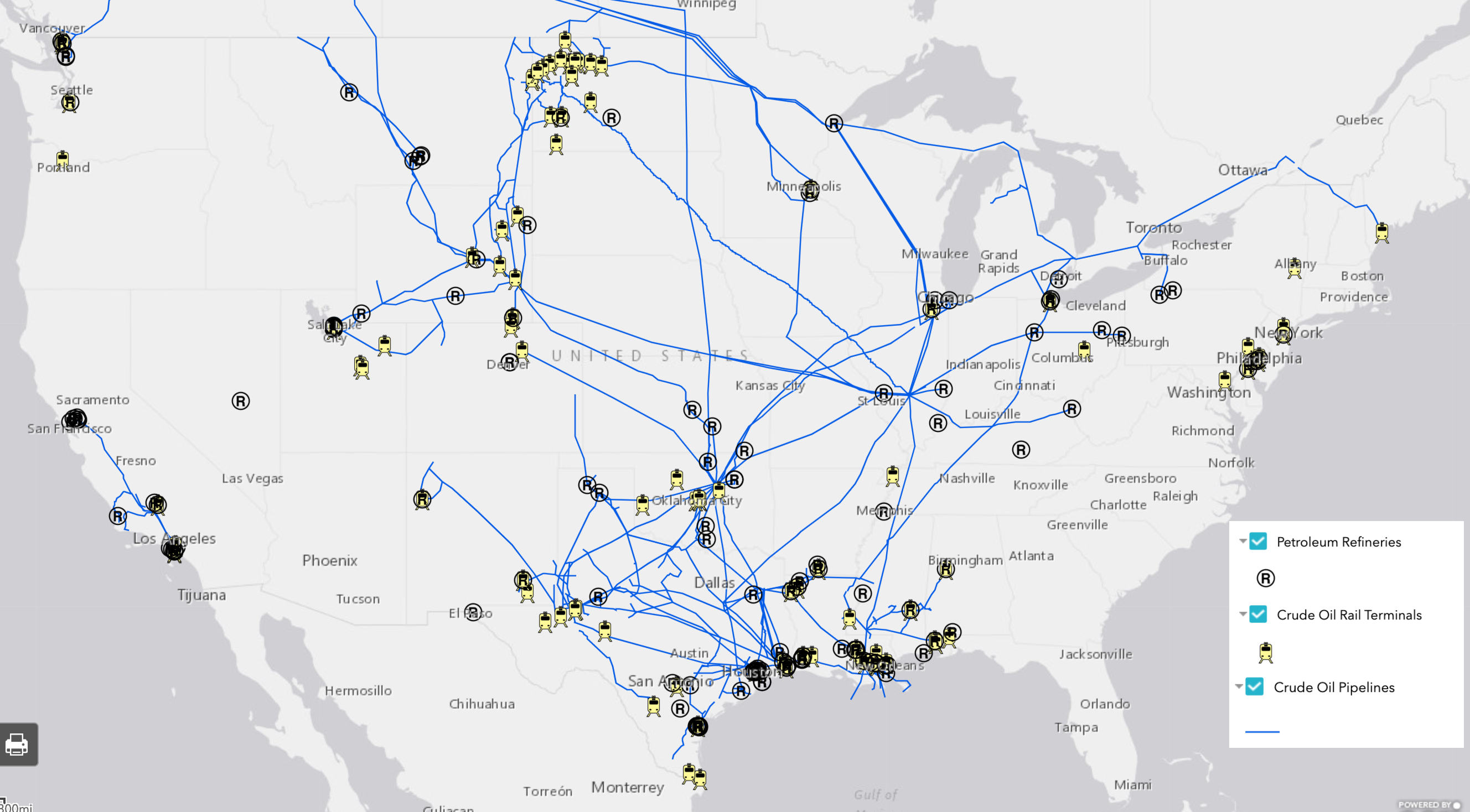 In 2018, approximately 28% of total U.S. energy consumption was for transportation. To understand the scale of infrastructure that serves this sector, it’s helpful to click on the petroleum refineries, crude oil rail terminals, and crude oil pipelines on the map.