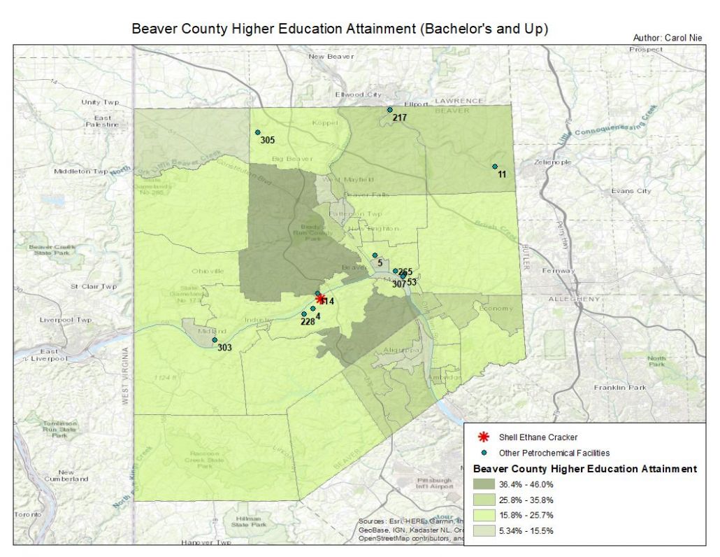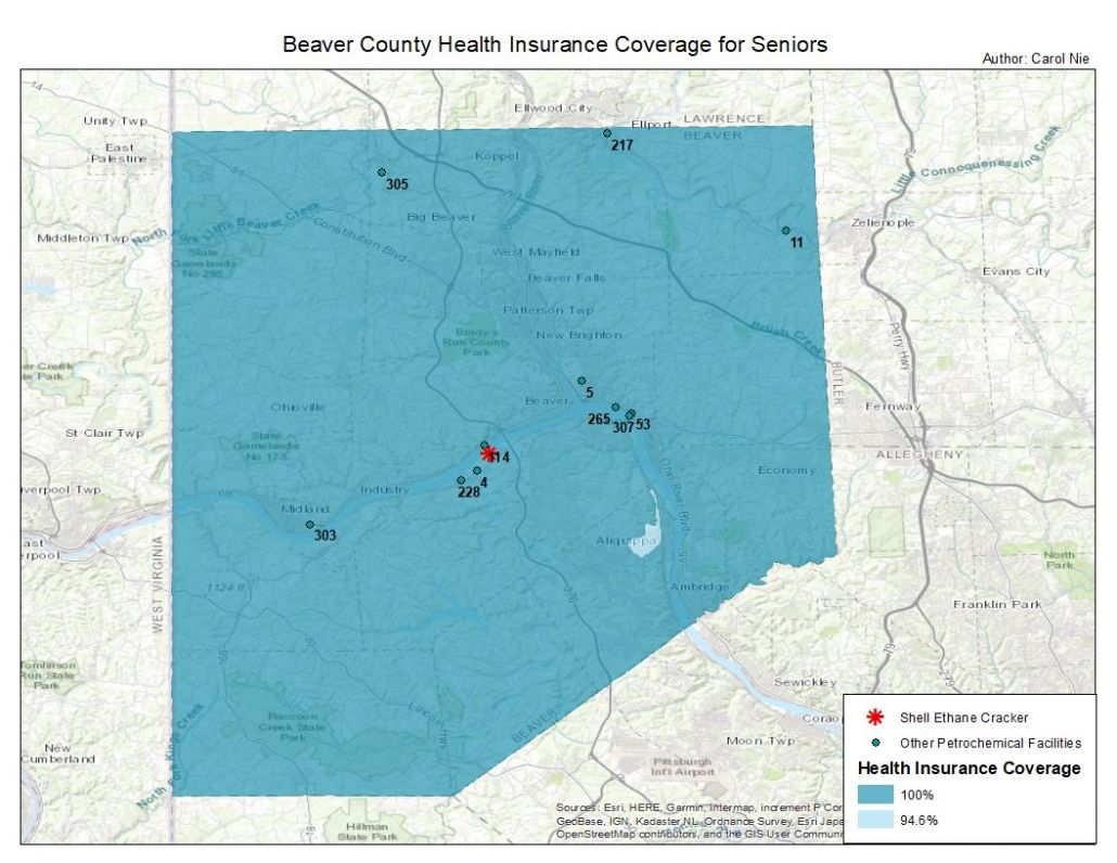 For the residing population, Beaver County has an overall aging population that is more vulnerable to environmental issues, and has a population with slightly less higher education attainment, which may present environmental justice and health concerns. Although the community is predominantly white, people of color cluster in certain regions, where other issues like health insurance, poverty, and education are also a concern. More research should be conducted to look at other pollution sources and these communities.