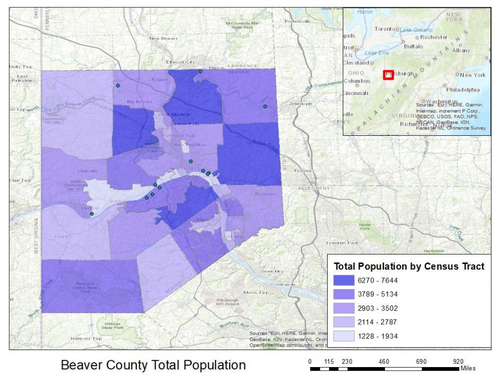Beaver County total population is estimated 163,929 people. Figure 3 shows there are only a few tracts with a population greater than 6,000.