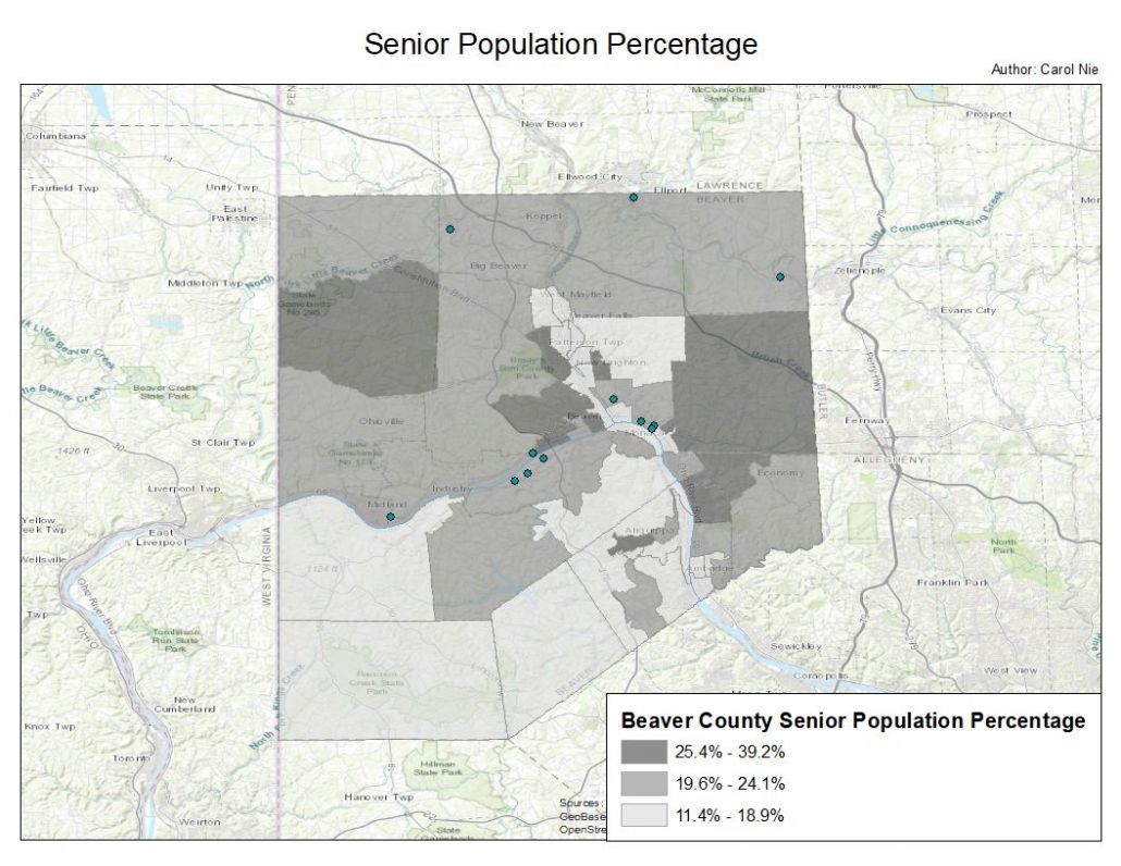 Figure 4. Senior (65 or older) Population in Beaver County, PA, by census tract. Source: US Census Bureau