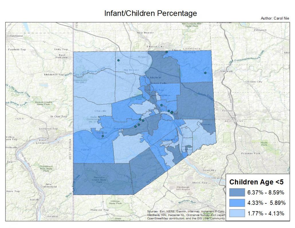 Figure 5. Population of children five years or younger in Beaver County, PA, by census tract. Source: US Census Bureau