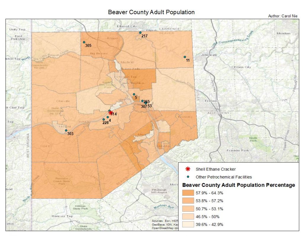 The first focus of the project was to calculate the load of certain toxins petrochemical facilities in Beaver County are permitted to discharge into the upper Ohio River, including the addition of the ethane cracker plant, and to study the chemicals of concern—as well as their health impact—since most attention has focused on a single point source, instead of the cumulative impact. GIS was used to map Beaver County’s demographic data to better understand the population affected.