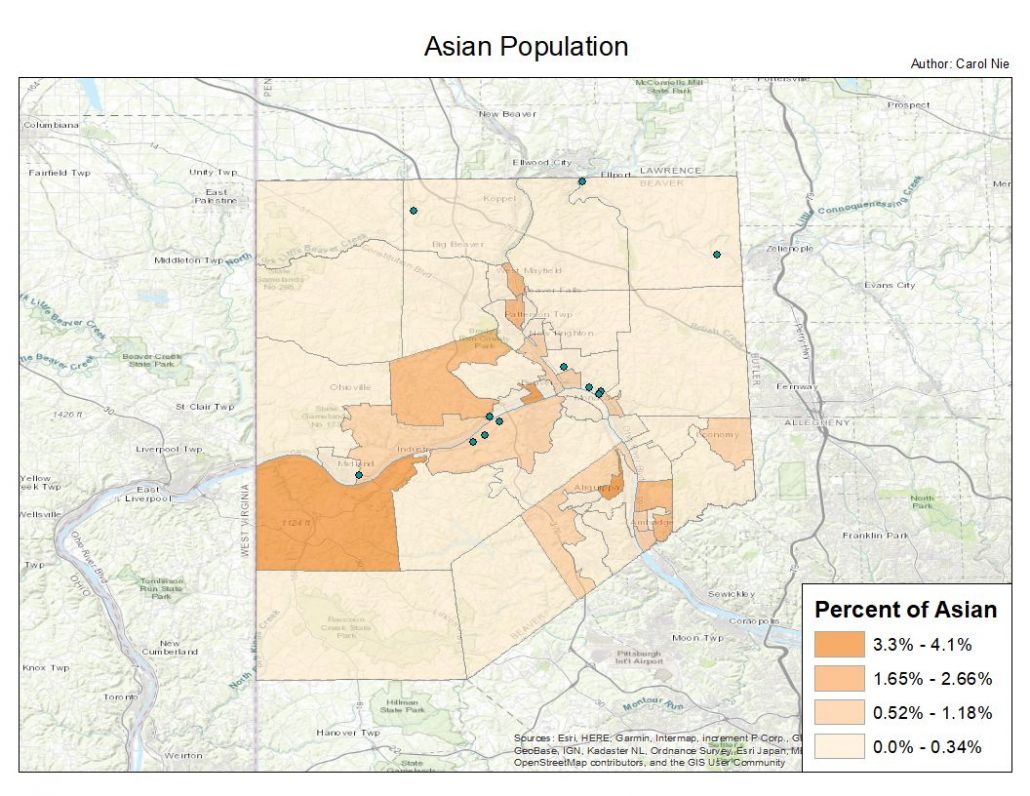 Figure 9. Percentage of Asian population in each census tract in Beaver County, Pennsylvania. Source: US Census Bureau