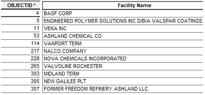 For this project, I chose to focus on all the petrochemical facilities (Figure 1) within the county, including the Shell ethane cracker (Figure 2), because although a few of them are not adjacent to the Ohio River, their runoff and discharge will eventually end up there. These businesses are classified in these categories: plastics material and resin manufacturing, paint and coating manufacturing, lubricant oils and greases, a former oil refinery, and other miscellaneous products.