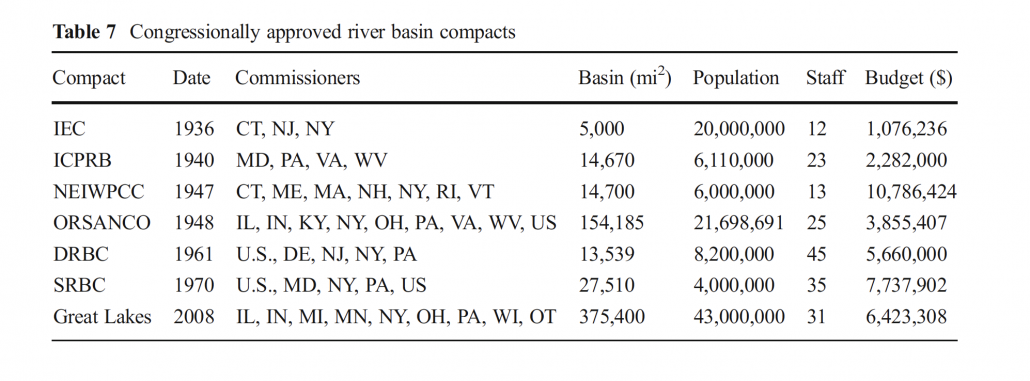 Figure 15. River basin compacts, their areas, population, staff, and budget. Delaware River Basin Comission is DRBC, Ohio River Valley Water Sanitation Commission is ORSANCO. Source: Governance, Policy, and Economics of Intergovernmental River Basin