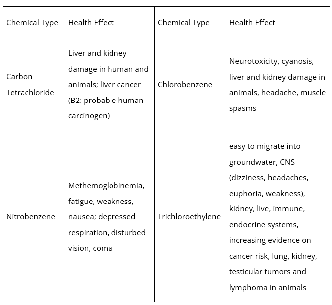 Among these four, carbon tetrachloride is a B2 group carcinogen, meaning it is probably carcinogenic to humans, and specifically may cause liver cancer in humans. Another chemical, trichloroethylene, can easily migrate into groundwater, and it’s the most commonly found contaminant in drinking water supplies in the country. There is increasing evidence that trichloroethylene can increase cancer risk, as experiments showed lung, kidney, testicular tumors, and lymphoma in animals. The EPA is still reclassifying this chemical as a carcinogen.