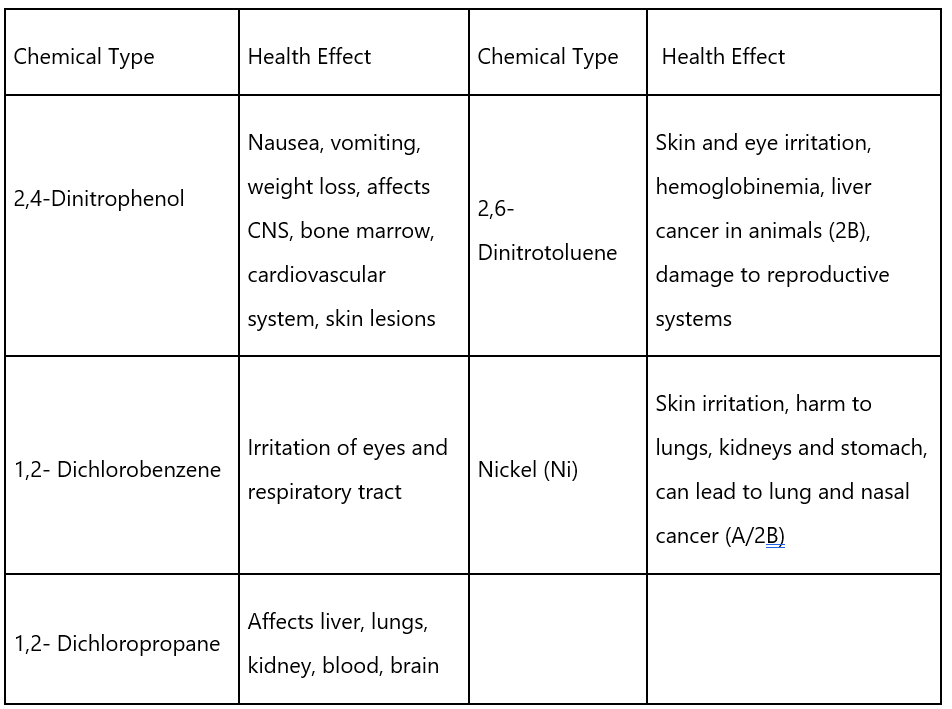 In summary, they can cause eye and skin irritation, act on multiple organs, and the central nervous, reproductive, and cardiovascular systems. Other notable things from this list is that 2,5-dinitrotoluene and nickel are likely human carcinogens.