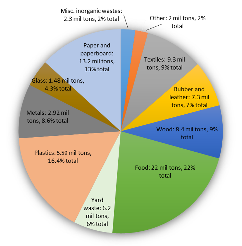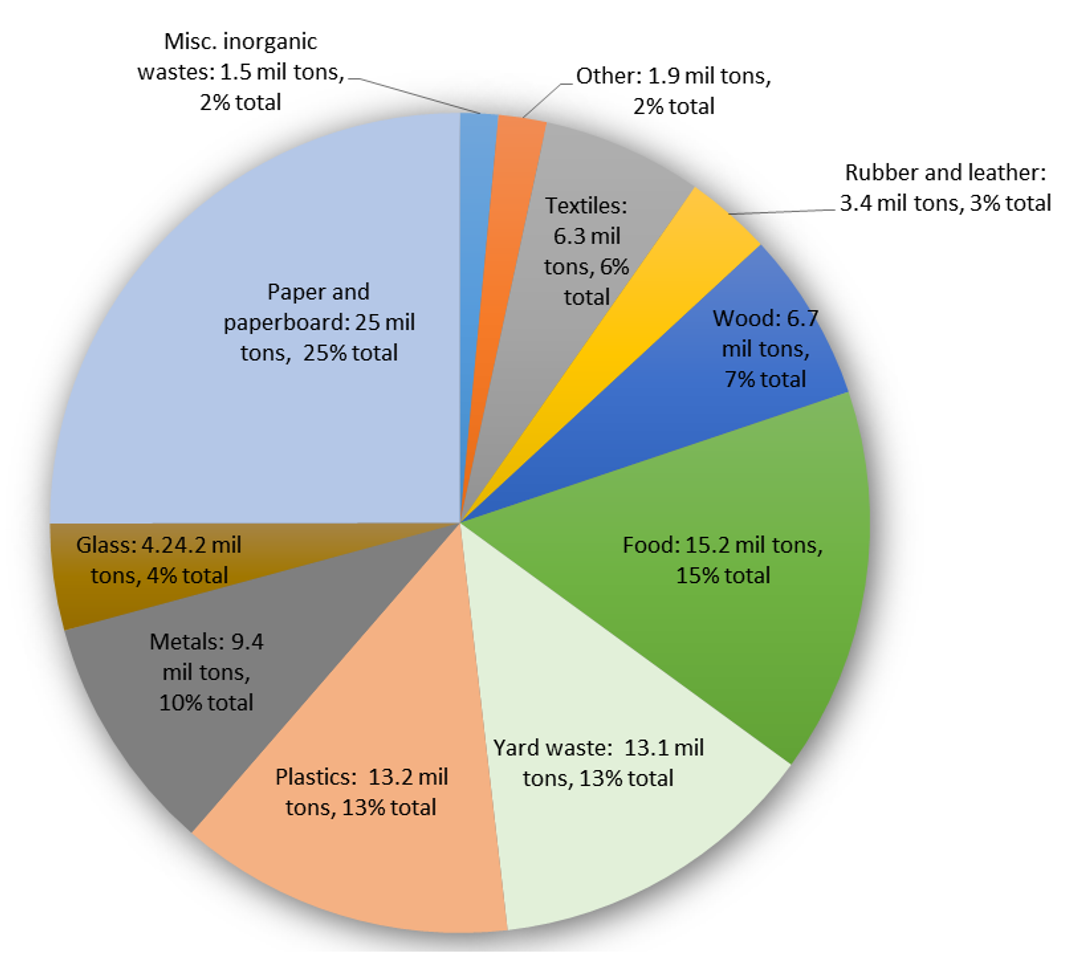Figure 1: A breakdown of the 267.78 million tons of municipal waste that were generated in the US in 2017. Source: figure developed by FracTracker Alliance, based on 2017 EPA data. Source: https://www.epa.gov/facts-and-figures-about-materials-waste-and-recycling/national-overview-facts-and-figures-materials