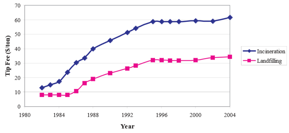 Figure 12. Costs of incineration per ton are nearly twice that of landfilling. Source: National Solid Waste Management Association 2005 Tip Fee Survey, p. 3.