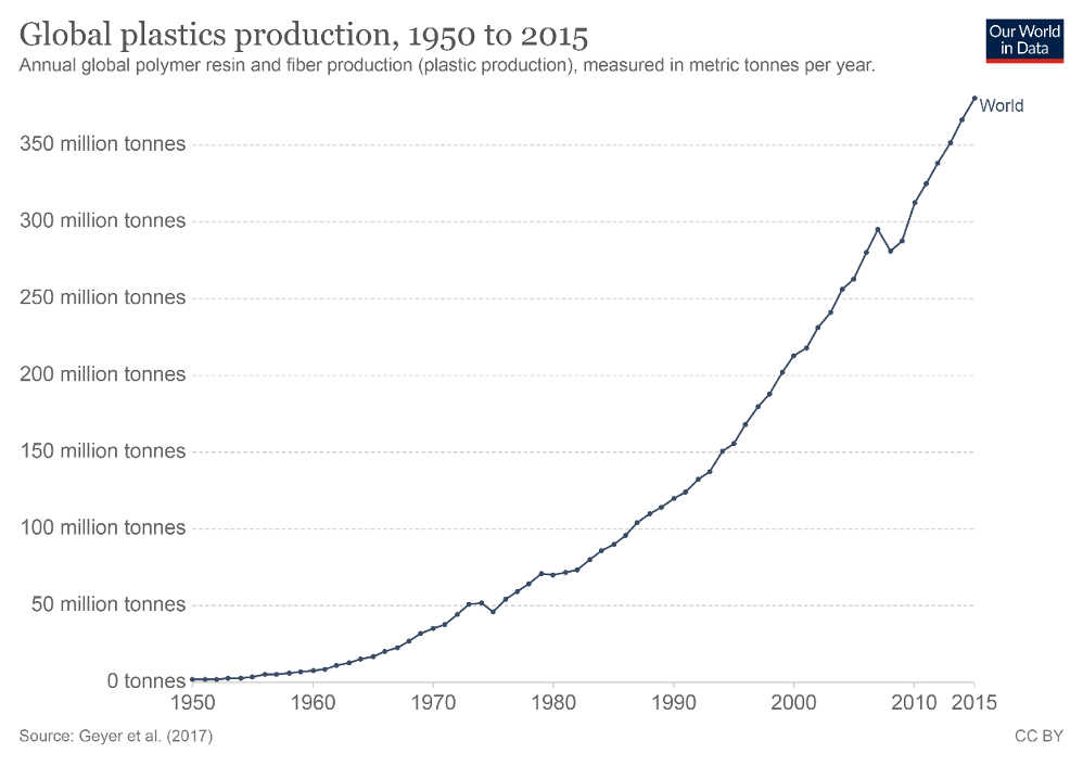 Figure 2: Increase in global plastics production, 1950-2015, Source: Geyer, R., Jambeck, J. R., & Law, K. L. (2017). Production, use, and fate of all plastics ever made. Science Advances, 3(7), e1700782. Available at: http://advances.sciencemag.org/content/3/7/e1700782 Referenced in https://ourworldindata.org/plastic-pollution