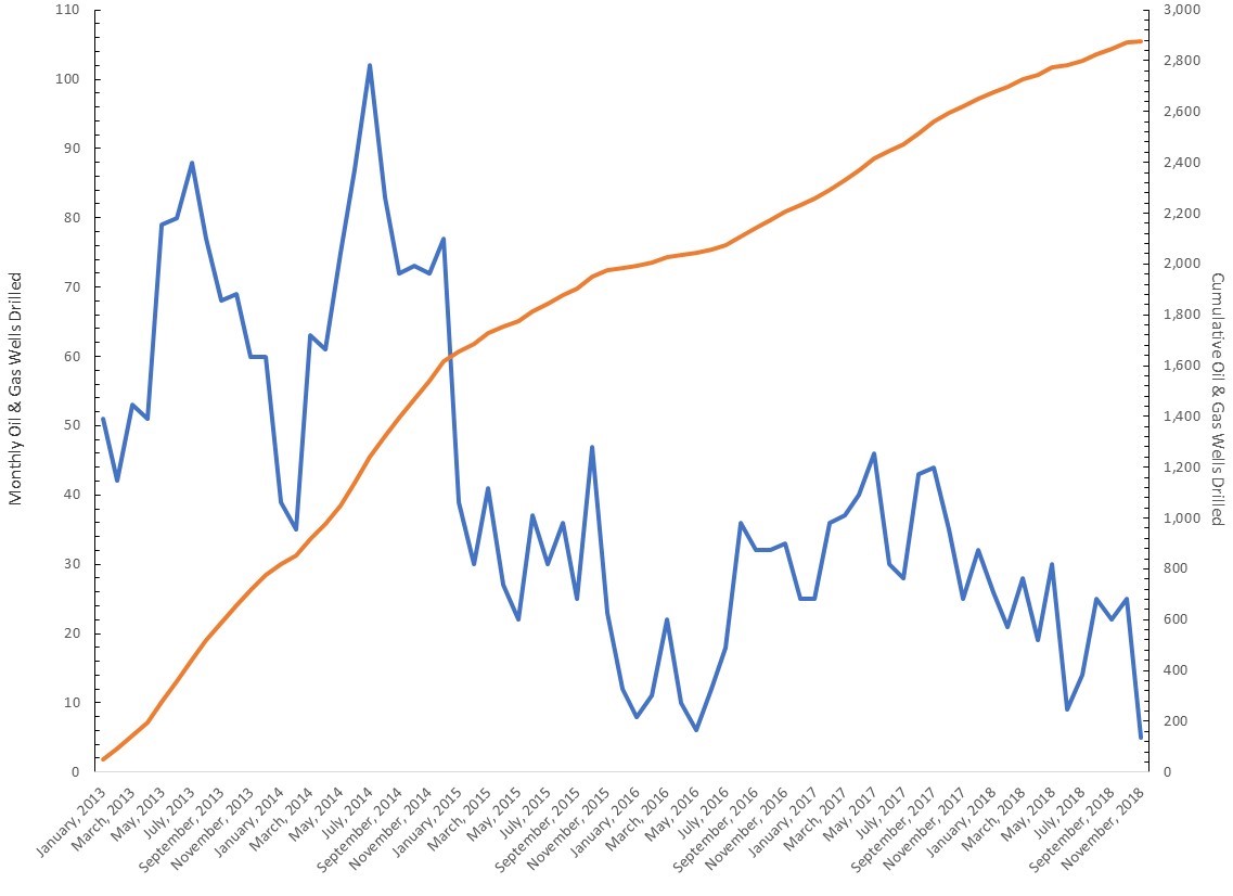 Figures 1. Monthly (in blue) and cumulative (in orange) unconventional oil and gas wells drilled in Ohio, January, 2013 to November, 2018