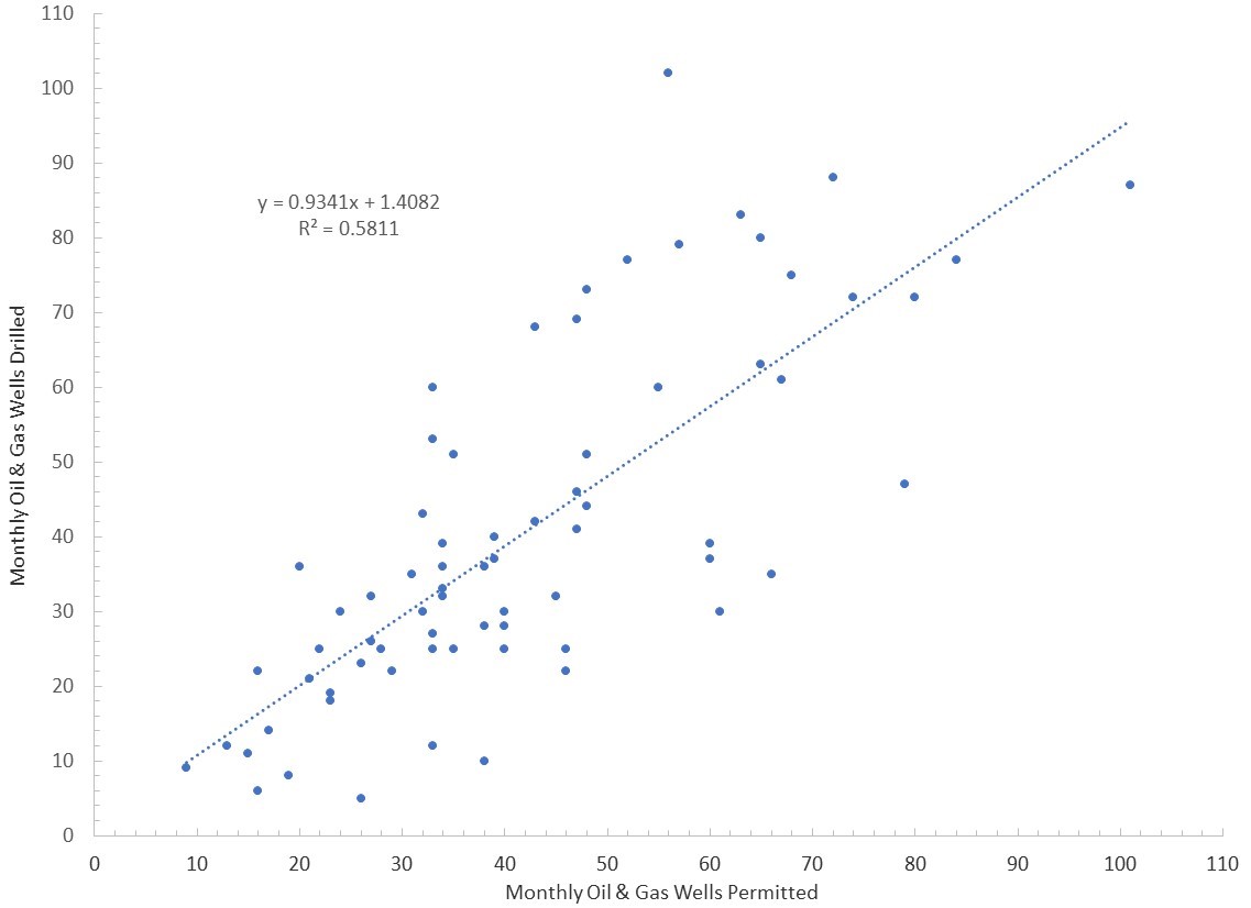 Figure 2, below it, shows the relationship between the number of wells that are permitted verse those that are actually drilled. ![]()