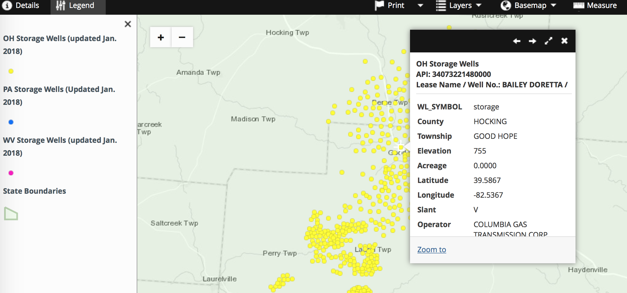 The colored areas on the map above (pink, blue, and yellow) correspond to gas storage wells in one of the three states. When you first view the map in fullscreen mode you will notice that these wells have been “generalized” into one large layer. That feature allows the map to load more quickly in your browser.