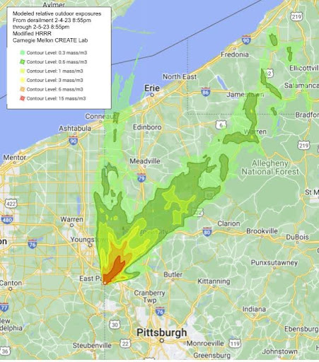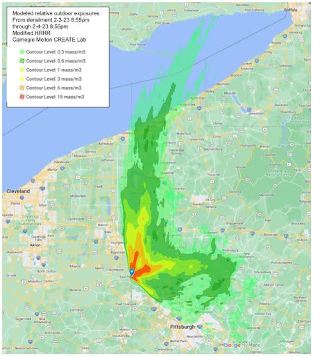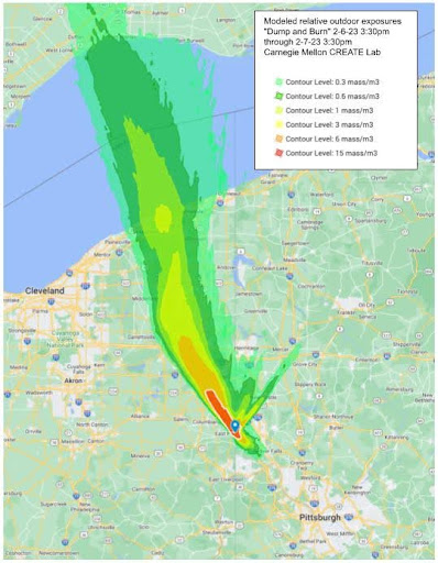 The above photos show the fire and smoke plumes from the East Palestine vinyl chloride burn as done through modeling by the Carnegie Mellon CREATE Lab. How much more of the population and land was affected by the toxic plume than we have acknowledged? The East Palestine(EP) residents that I have been in contact with have told me that they have suffered greatly because the health response for their chemical exposure was severely lacking. Urine and blood samples were not collected in a timely manner, losing the critical window for detection before chemicals became sequestered in their tissues. They relayed that more chemicals are created from burning them thus the exposure is to more chemicals than to what is known. Months after the derailment and burn, the CDC came in to speak with the EP community. Upon asking how they could get the chemicals out of their bodies, they proceeded to tell them, “Look we know you have been exposed. We don’t know how to get those chemicals out of your body, but we do know how to treat the cancers that may come later.”²⁶ Lisa Cochran from the OEPA confirmed with me that human remediation is not part of the EPA process, but they communicate with the Health Department. However, when questioning potential health consequences from the dioxin violations from 2006, an Eaton Township property owner who is a registered nurse and disabled combat vet as a result of chemical exposures was told by our local Lorain County Health Department that what goes on at Ross is not part of their jurisdiction.