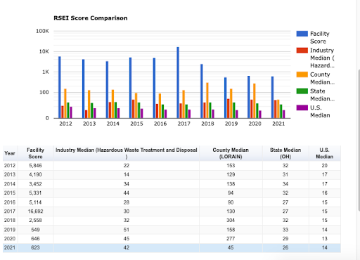 Ross’ facility’s RSEI score comparison in blue shows that their facility’s emissions are well above the median hazardous waste disposal score. These numbers indicate the relative, elevated risk to our health including cancer as a result of living within the community where Ross operates compared to other locations.
