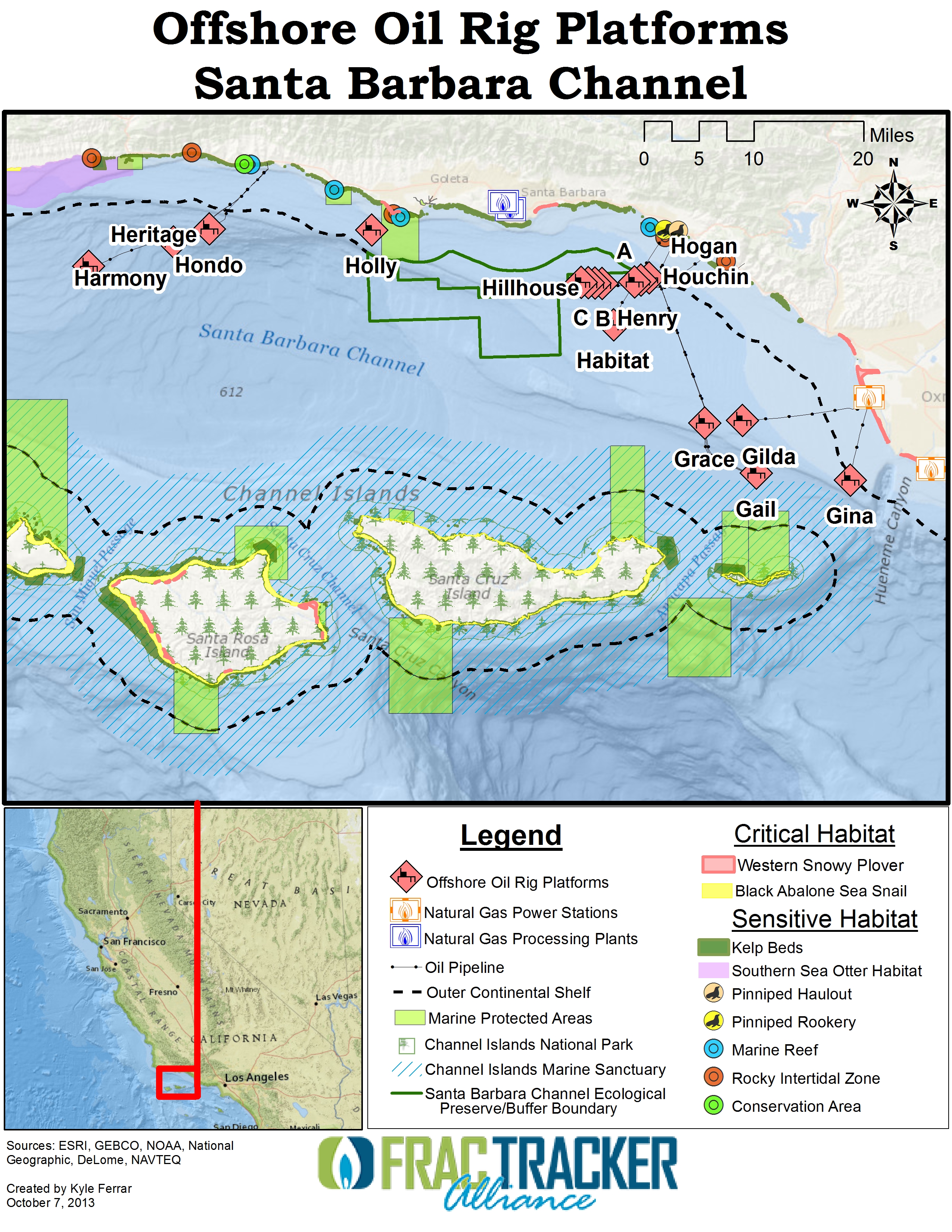 In 2013, The FracTracker Alliance collaborated with the Environmental Defense Center on the report Dirty Water: Fracking Offshore California. The report showed that much of the offshore oil is extracted by hydraulic fracturing (Fig 1.), and outlined the environmental impacts that would result from a spill of this magnitude.