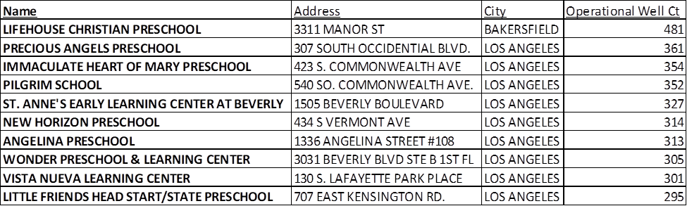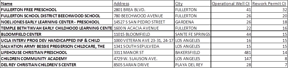 Table 1. Top ten childcare centers with the highest counts of operational oil and gas wells within the 3,200-foot public health protection zone. There were 558 childcare centers in Los Angeles County within 3,200 feet of an operational well, followed by Orange County (107), San Diego (42), and Kern (26). Wells within 3,200 feet of the Lifehouse Christian Preschool also received 14 rework permits during the first three quarters of 2023.