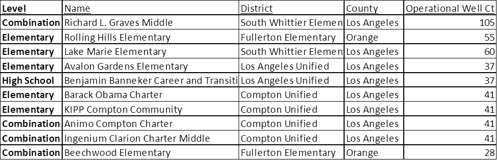 Table 3. Top ten Primary/Secondary Schools with the highest counts of operational oil and gas wells within the 3,200-foot public health protection zone.