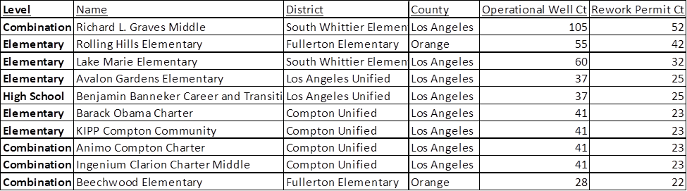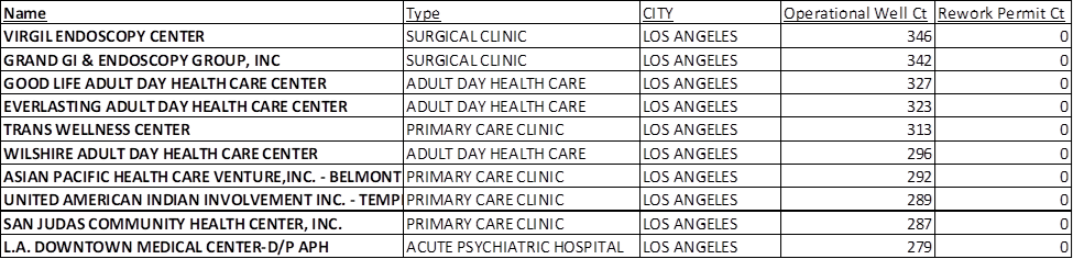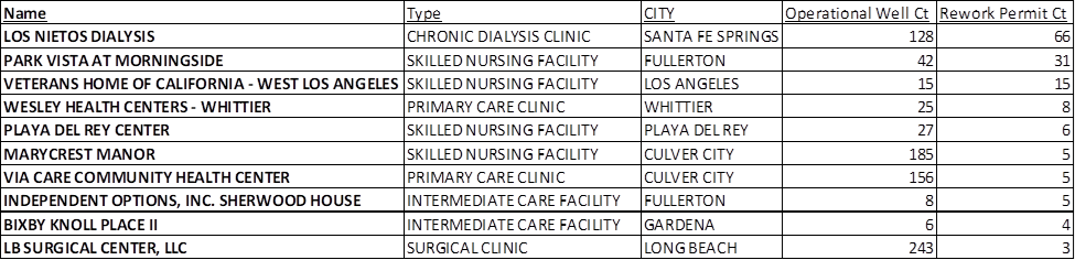 Counts of wells within the 3,200-foot public health protection zones of individual facilities were summed using GIS techniques (ESRI ArcGIS Pro V 3.1.2). Tables of the facilities with the most operational wells are shown below in Tables 1-5. The tables also present the counts of rework and workover permits issued for wells within the 3,200-foot protection zone.