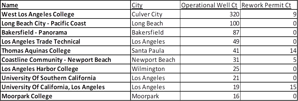 Table 5. Top ten Colleges and Universities with the highest counts of operational oil and gas wells and rework permits within the 3,200-foot public health protection zone during the first three quarters of 2023.