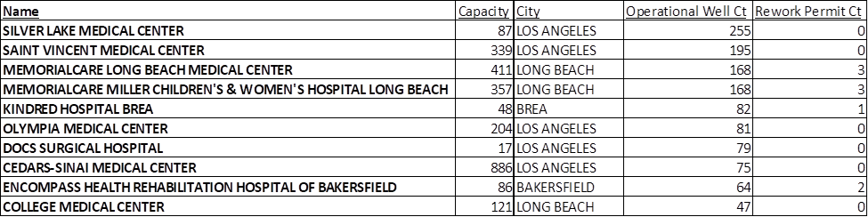 Individuals with compromised immune systems are also at elevated risk of negative health impacts as a result of exposures to the pollutants released from oil and gas extraction activities and well sites. This analysis therefore identifies the acute care hospitals and other healthcare facilities where oil and gas wells are currently operating within the proposed 3,200-foot public health protection zone. Counts of rework permits issued by CalGEM so far in 2023 were also summed (January 1, 2023 – September 30, 2023) for the wells operating in the protection zones; results of which are shown in Tables 6-8. An interactive map of these wells and the healthcare facilities is shown below in Figure 3.