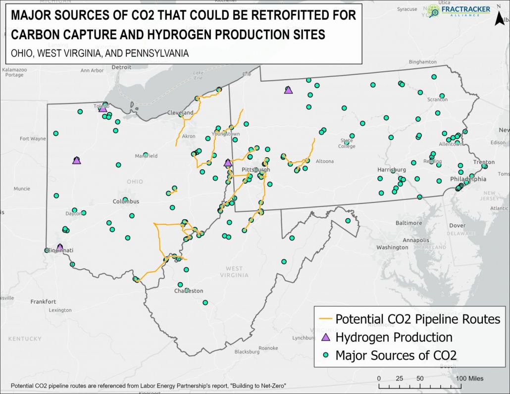 Source: Facilities were obtained from the EPA’s FLIGHT dataset, which can be downloaded here. A shapefile of the selected sites, filtered and mapped by FracTracker Alliance can be downloaded here. Notes: This shapefile shows uses EPA FLIGHT data filtered to include powerplants that reported >500,000 metric tons of CO2 emissions and industrial sites that reported greater than >100,000 metric tons of CO2 in 2020. These sites reported could qualify for the 45q tax credit. This methodology was based of the report, An Atlas of Carbon and Hydrogen Hubs for United States Decarbonization. These are not the only sites in the region that could have future carbon capture technology.