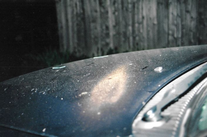 Another photo shows particulate of different sizes deposited on the hood of a car after “dusting” operations.