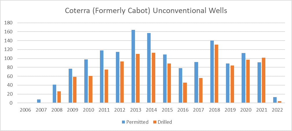 Figure 3) Permitted and drilled (determined according to spud date) of Coterra unconventional wells. Data Source: PA DEP, downloaded March 2022.