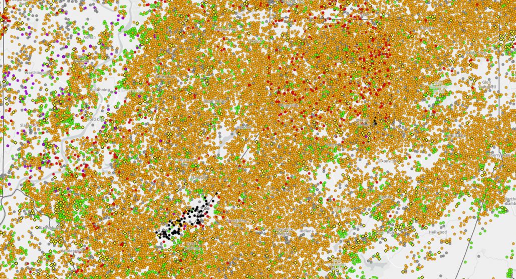 But there is still good news for those who enjoy looking at maps with thousands of dots on it, as the screenshot of the border between Armstrong County and Indiana County demonstrates.