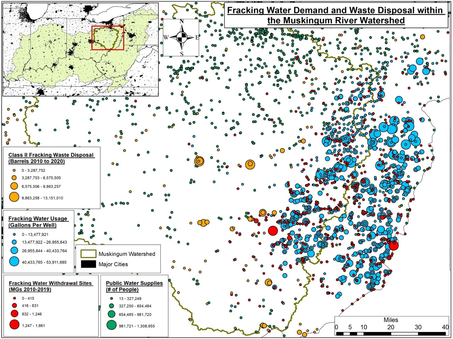 According to data from FracTracker Alliance, at the end of 2018, 42 percent of the water used by the fracking industry in Ohio has come from the Muskingum Watershed. Additionally, 50 percent of the water withdrawal sites are in the watershed. About 33 percent of the Class II injection wells are in the watershed and to date they have taken in 44 percent of the fracking waste. About 42 percent of the fracking related compressor stations that have gone in are also in the watershed. Of all Utica/Point Pleasant/Marcellus wells, 44 percent are in the watershed. Five of the twenty-seven Class II injection well proposals pending permit are also in the watershed. Five of the seventeen recently proposed or constructed Natural Gas Power Plants are in the watershed with a sixth (the 1085 MW Harrison Plant) being constructed on the edge of the watershed. The capacity of the five newly constructed gas power plants account for 33 percent of the recently proposed or installed natural gas plant capacity.