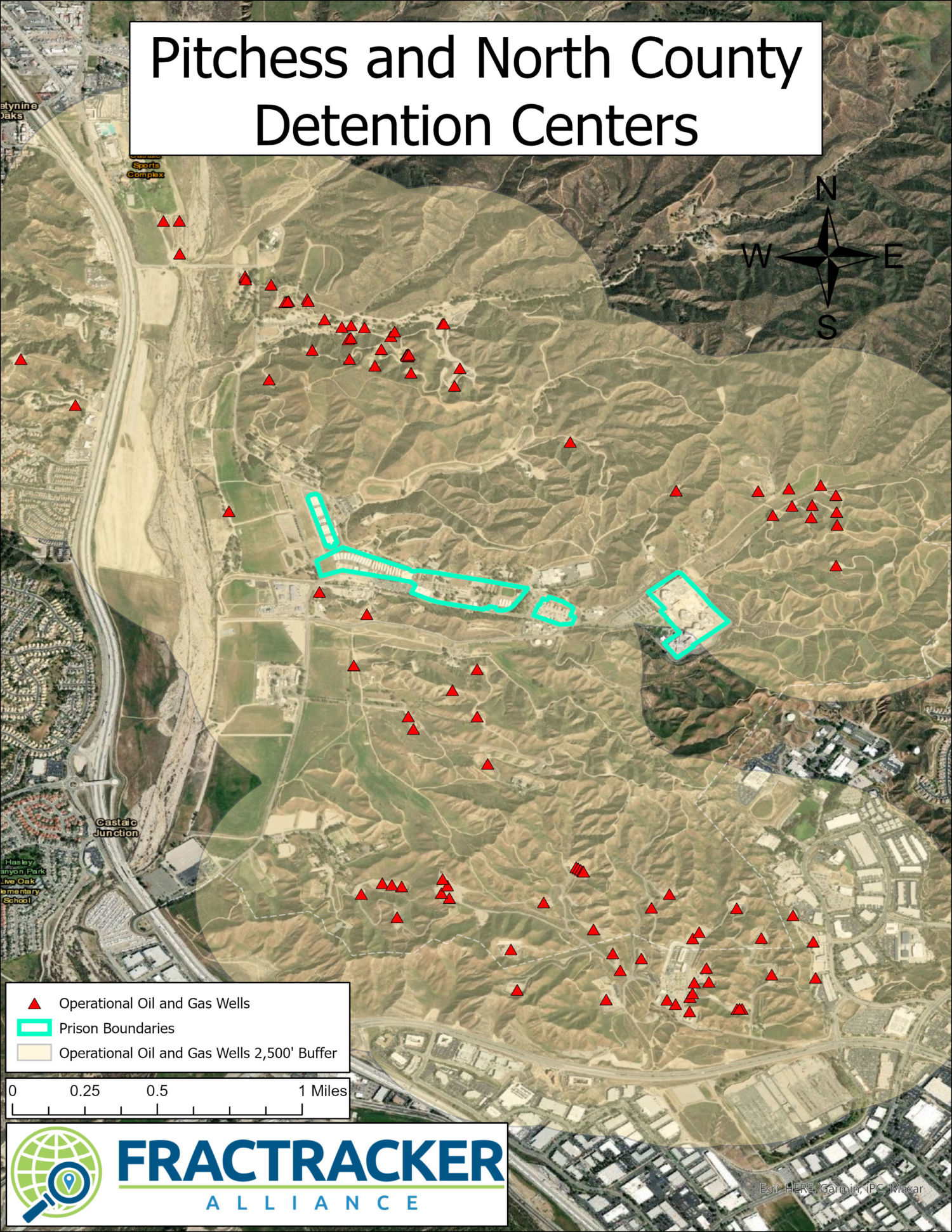 The entire prison system is an extractive industry, and like other industrial operations, prisons are located in industrial-zoned areas neighboring oil fields, drilling operations, refineries, and other petrochemical facilities. The map on Page 2 shows the industrially zoned portion of the Los Angeles suburb Santa Clarita, where the Pitchess Detention Center and North County Correctional Facility are located, housing nearly 7,000 incarcerated prisoners. The prison buildings are within 2,500’ of more than two dozen operational oil and gas wells, and there are over 100 more operational wells within the neighboring oil field.