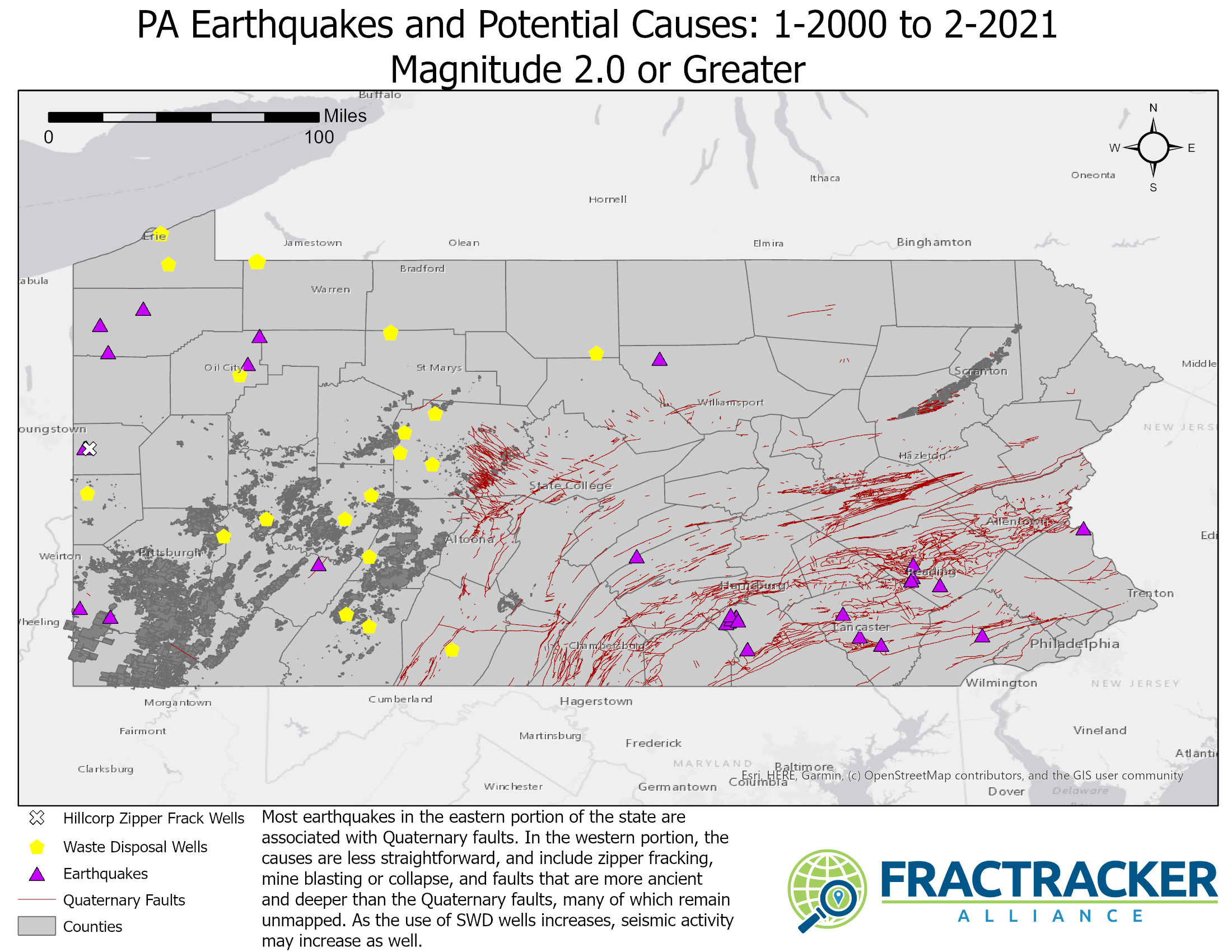 Figure 3. PA Earthquakes and Potential Causes: 1/2000 – 2/2021, Magnitude 2.0 or Greater. Most earthquakes in the eastern portion of the state are associated with Quaternary faults. In the western portion, the causes are less straightforward, and include zipper fracking, mine blasting or collapse, and faults that are more ancient and deeper than the Quaternary faults, many of which remain unmapped. As the use of SWD wells increases, seismic activity may increase as well.