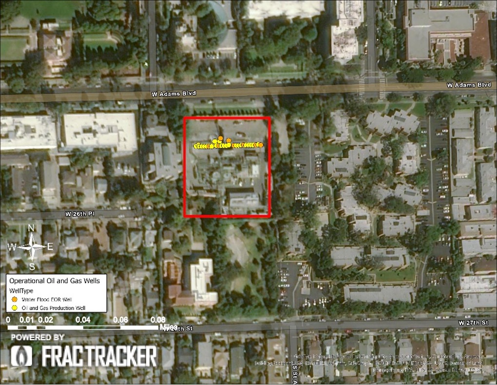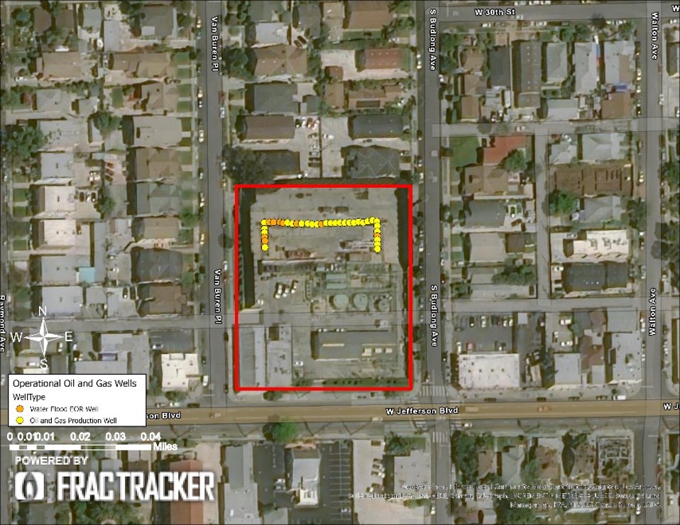 The Murphy Drill Site in Los Angeles has been a long-standing nuisance and source of harmful pollution for neighbors in Jefferson Park. The site houses 31 individual operational wells, including 9 enhanced oil recovery injection wells and 22 oil and gas production wells, as shown below in the map in Figure 1. The wells are operated by Freeport-McMoran, while the site is owned by the Catholic archdiocese of Los Angeles. The site is within 200 feet of homes, playgrounds and a health clinic. There are over 16,000 residents within 2,500’ of the site, as well as a special needs high school, an elementary school, a hospice facility, and a senior housing complex.