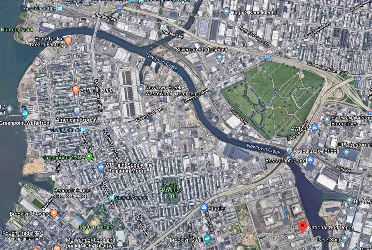 National Grid Depot is located on the western bank of Newtown Creek. Source: Google Maps