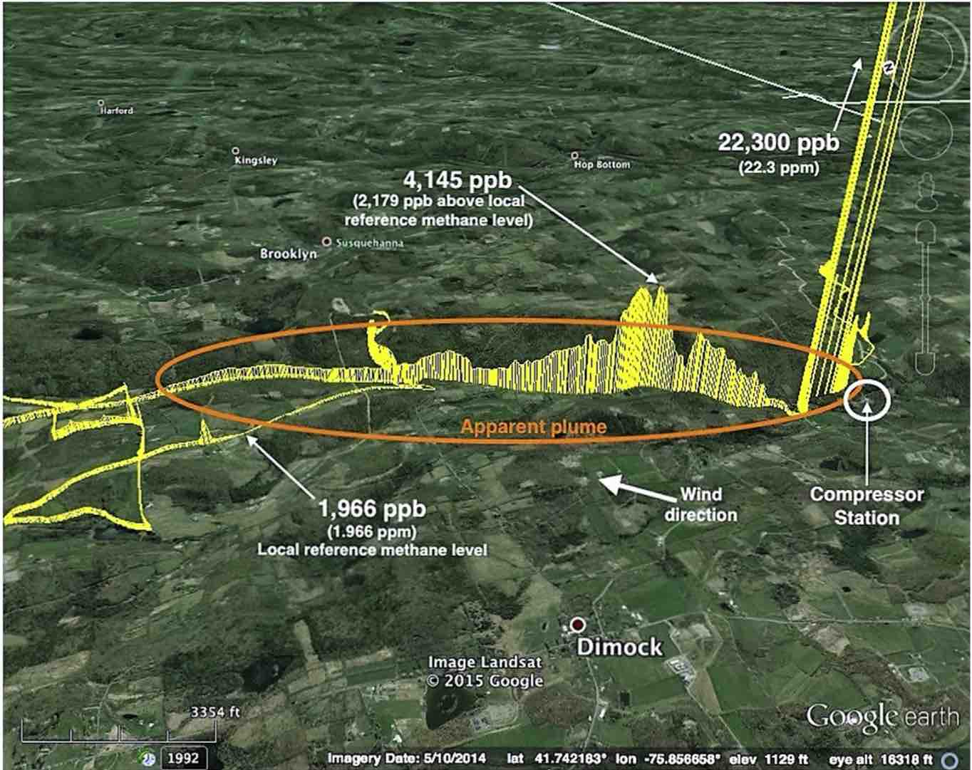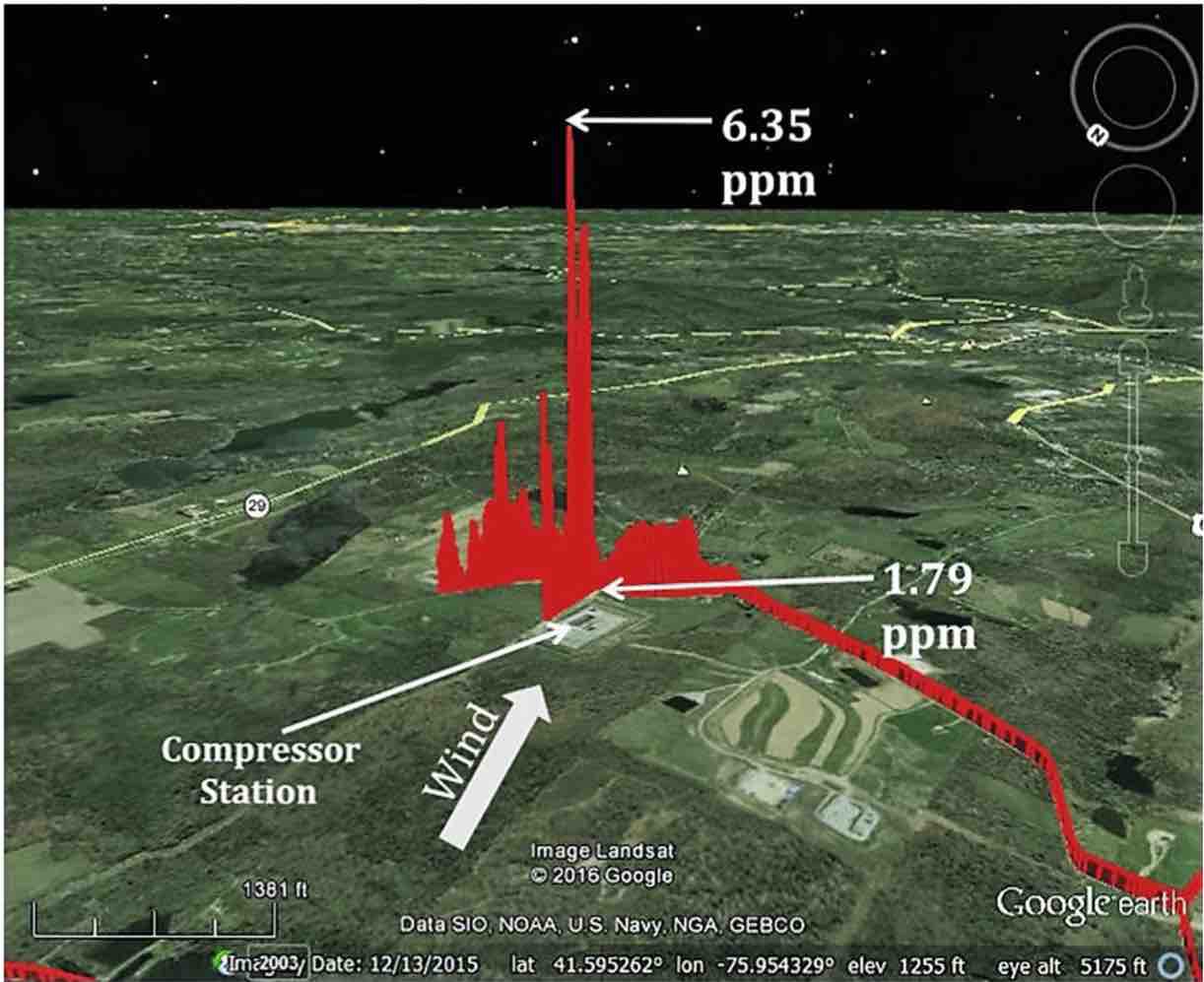 Figure 4. Methane emission plumes from compressor stations near Dimock, Pennsylvania (left) and Springvale, Pennsylvania (right). Source: Copied from Payne et al. 2017.