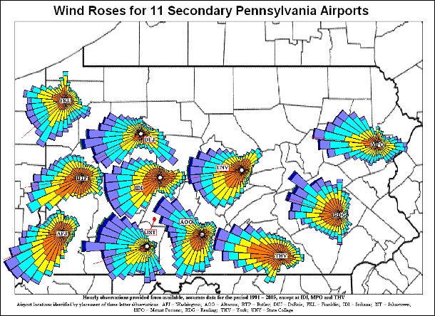 Figure 7. Wind patterns at small airports around Pennsylvania 1991-2005 showing predominant direction of wind and velocity in knots (Orange 0 – 4, Yellow 4 – 7, Turquoise 7 – 11, Medium Blue 11 – 17, Dark Blue 17 – 21). Source: The Pennsylvania State Climatologist.