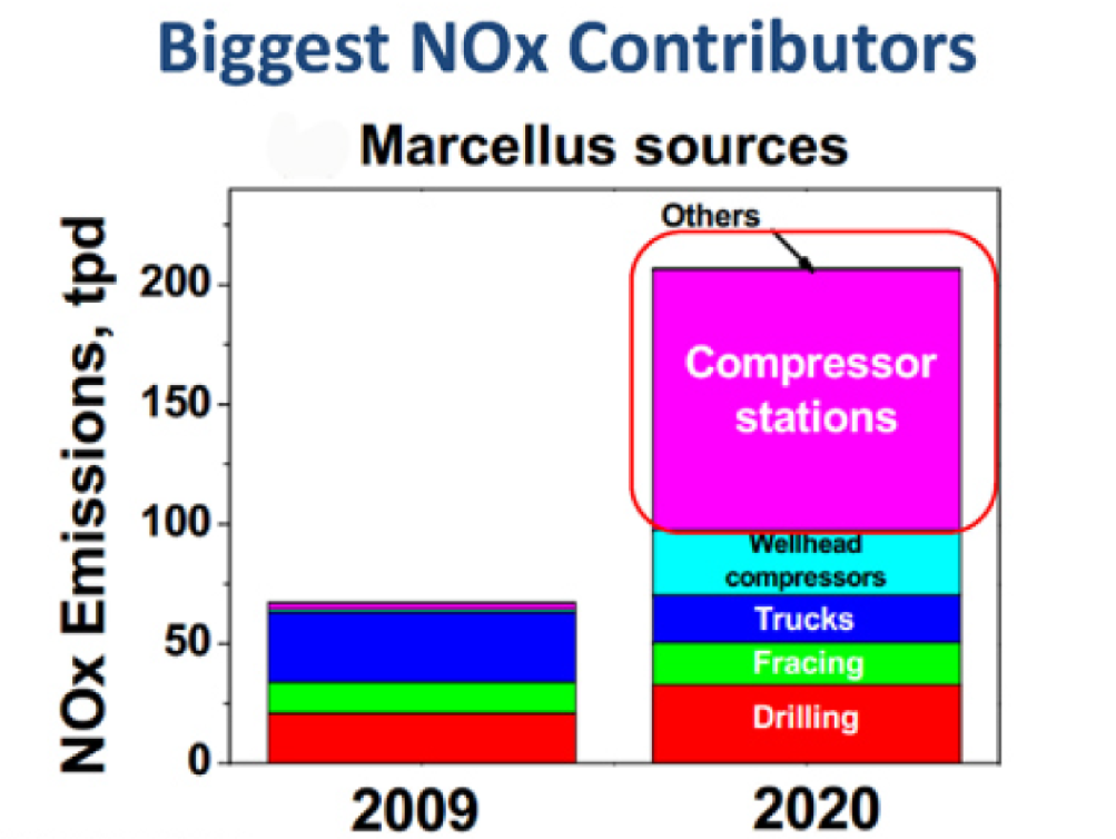 CS emissions contribute major air pollutants to the total pollution from unconventional gas development (UCGD), but their role in regional air quality problems has not always been noted. In 2009, when UCGD operations were only a few years in this region and many CS had not yet been built, CS emissions were estimated to be a small component. Now, in 2020, gas transport requirements have increased, leading to many more and larger CS. The amounts of CS emissions have increased accordingly, based on estimates by Carnegie Mellon University atmospheric researcher, Robinson (Figure 1). Part of the reason that CS are such a major pollution source is that they run constantly, in contrast to machinery for well development and trucking that fluctuate with the market for new wells.