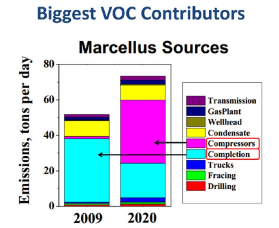 Figure 1. Relative contribution of compressor stations and other components of shale gas industry to Nitrous Oxides (NOx) and Volatile Organic Compounds (VOC). Source: Clean Air Council- adapted from webinar by Alan Robinson.