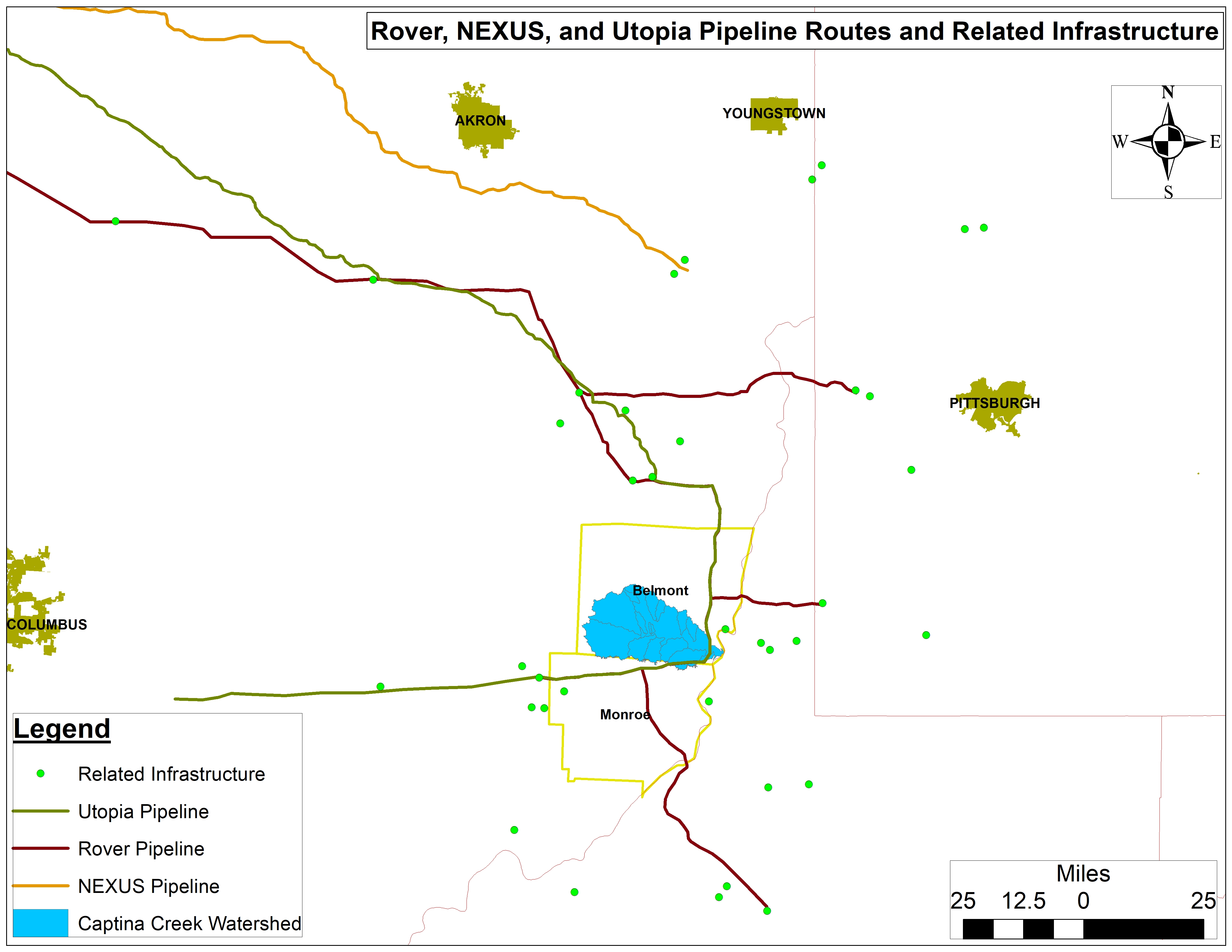 The Captina Creek Watershed straddles the counties of Belmont and Monroe in Southeastern Ohio and feeds into the Ohio River. It is the highest quality watershed in all of Ohio and a great examples of what the Ohio River Valley’s tributaries once looked, smelled, and sounded like. Sadly, today it is caught in the cross-hairs of the oil and gas industry by way of drilling, massive amounts of water demands, pipeline construction, and fracking waste production, transport, and disposal. The images and footage presented in the story map below are testament to the risks and damage inherent to fracking in the Captina Creek watershed and to this industry at large. Data included herein includes gas gathering and interstate transmission pipelines like the Rover, NEXUS, and Utopia (Figure 1), along with Class II wastewater injection wells, compressor stations, unconventional laterals, and freshwater withdrawal sites and volumes.