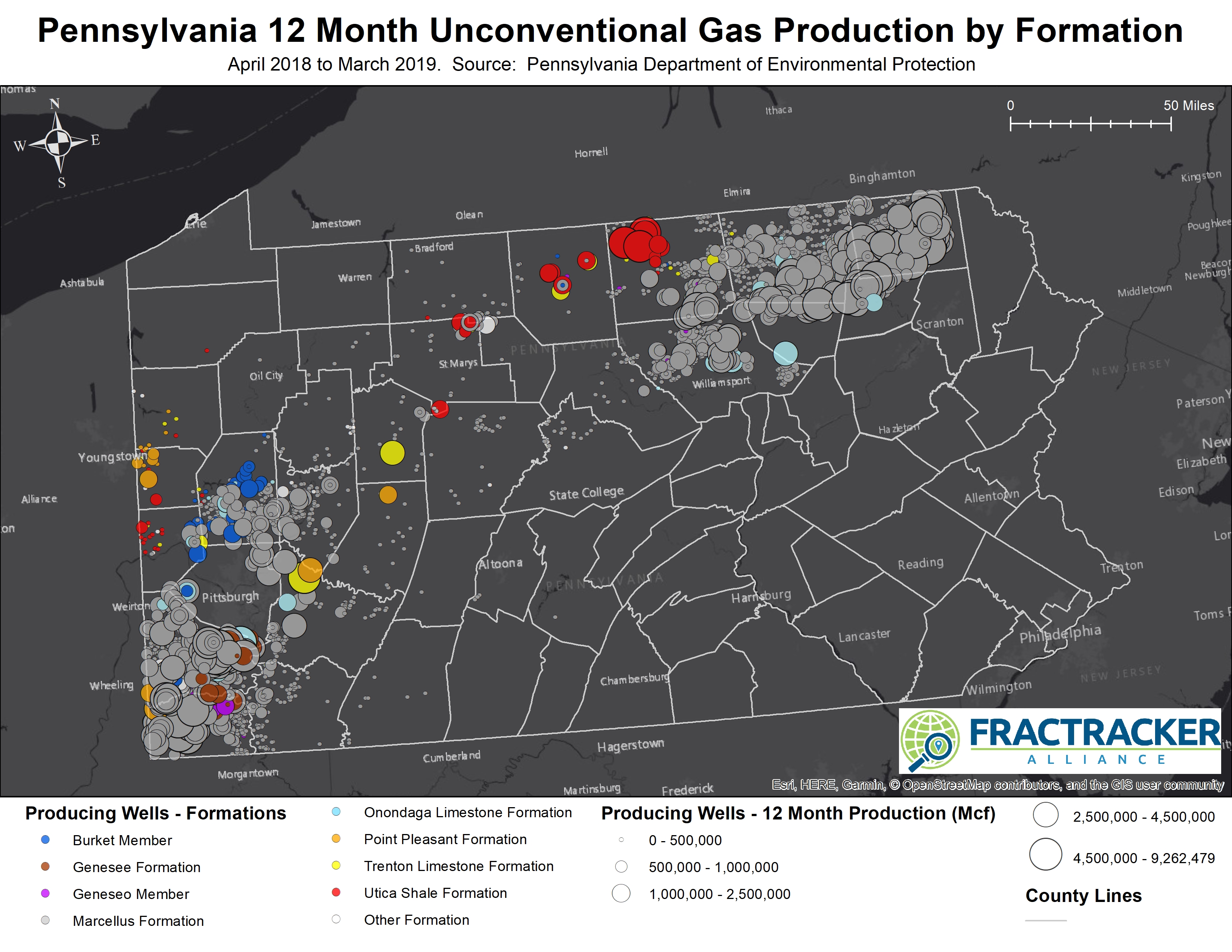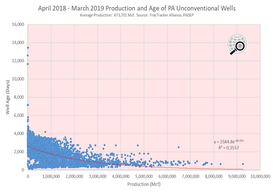 Finally, when comparing production, we must always take the age of the well into consideration, as all oil and gas wells can be expected to start off with a short period of very high production, followed by years of ever-diminishing returns throughout the expected 10 to 11 year lifecycle of the well. Because of this, what seems like a hotspot now may look below average in a similar analysis in three to four years, particularly in formations with relatively light drilling activity. This means that the top list of production by well could change over time, so be sure to check back in with FracTracker to see how events unfold.